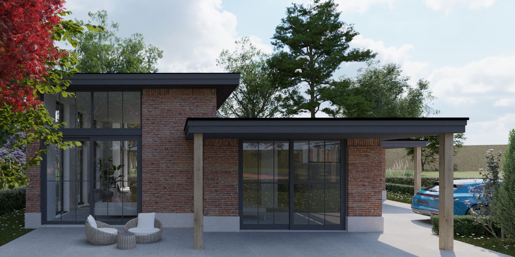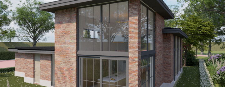 De architectuur is modern met traditionele kenmerken. De woning bestaat uit drie verschillende volumes met een eigen hoogte waardoor er een mooie gelaagdheid ontstaat. Het is een stoere combinatie van metselwerk gevels, houten accenten en een strakke detaillering. De verdiepte neggen en de verspringende gevels geven de nodige plastiek aan de gevels.