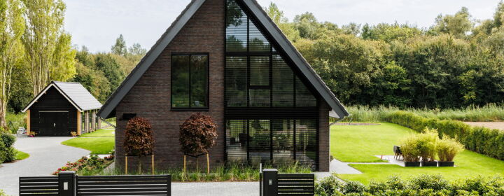 De grote glazen pui in de voorgevel is voorzien van aluminium louvres wat zorgt voor de benodigde zonwering en privacy. De zwarte kozijnen vormen een mooi contrast met de eiken voordeur en de eiken spanten.