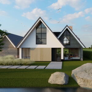 In de woonkeuken bevindt zich de royale vide wat voor een mooie verbinding zorgt met de verdieping. De gevels worden uitgevoerd in wit stukwerk gecombineerd met houten geveldelen en robuust metselwerk.