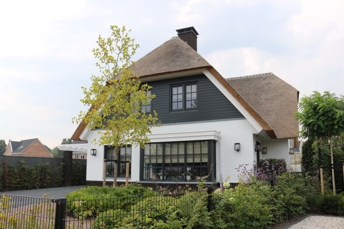Aan de rechterzijde van de woning bevindt zich de garage en het bijgebouw. De landelijk moderne woning met rieten kap, wit gekeimde metselwerk gevels met zwart houten gevelaccenten en Belgisch hardstenen dorpels heeft een landelijke uitstraling welke geheel past in de omgeving.