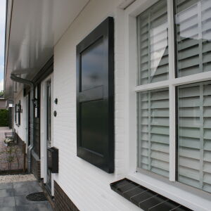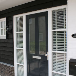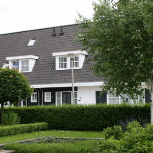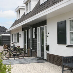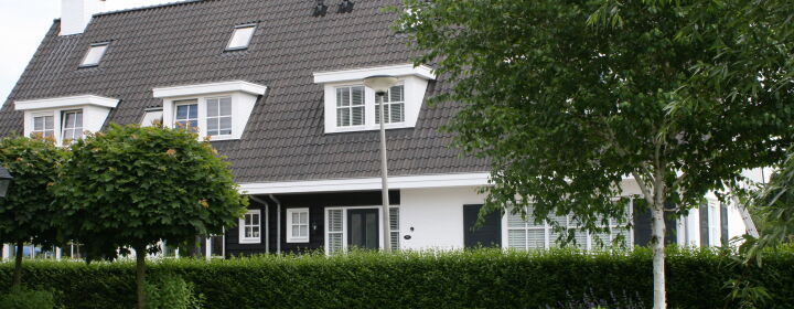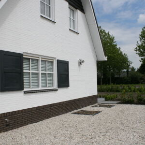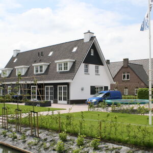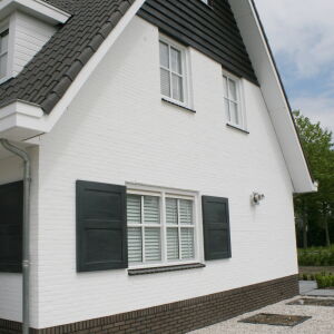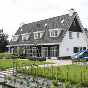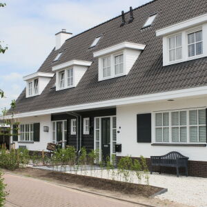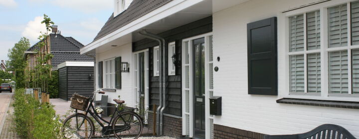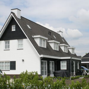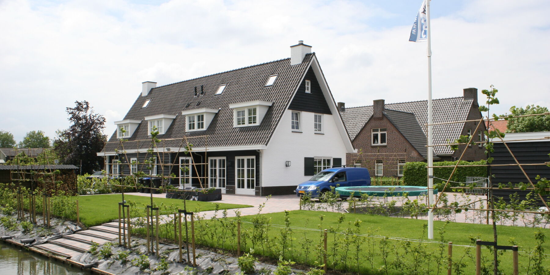 - Nieuwbouw twee onder een kap woning - De gevels van deze landelijke woning zijn bekleed met een combinatie van wit gevelstucwerk en zwart potdekselwerk. De zwarte luiken en de ramen met roeden versterken de landelijke bouwstijl.