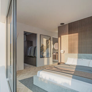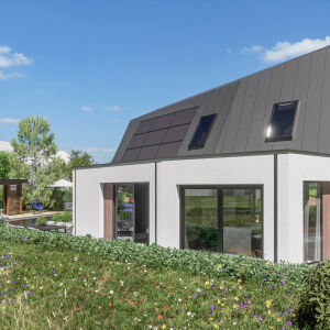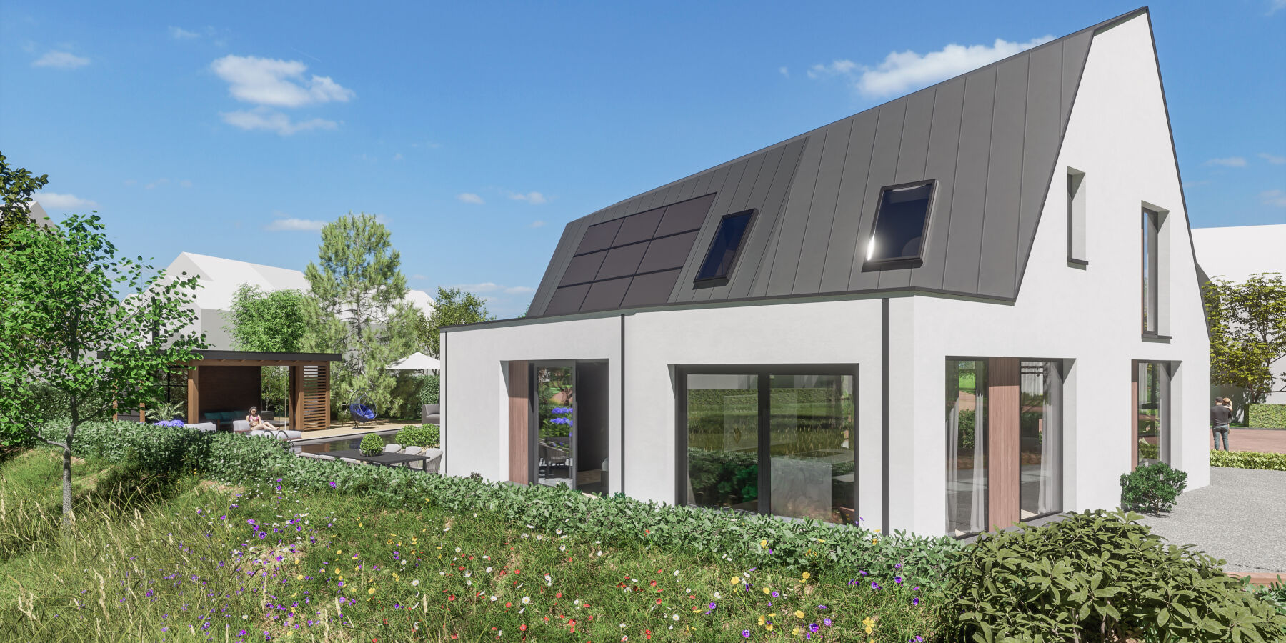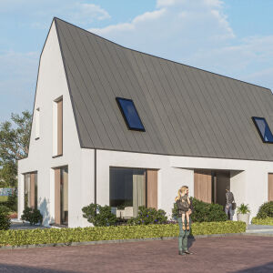 De woning is aan de buitenzijde afgewerkt met natuurlijk kalkstuc wat direct op kleur is gebracht waarbij de markante kapvorm wordt uitgevoerd met zink.