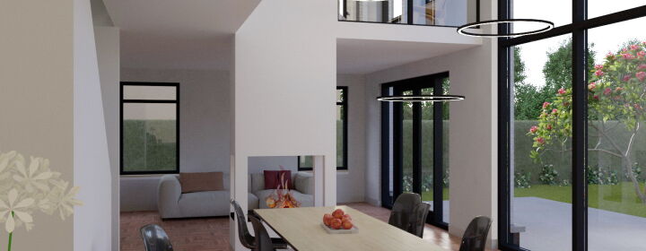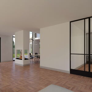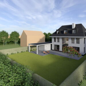 Aan de rechterzijde van de woning is het bijgebouw ontworpen met daaraan een veranda waar men optimaal kan genieten van het buitenleven.
