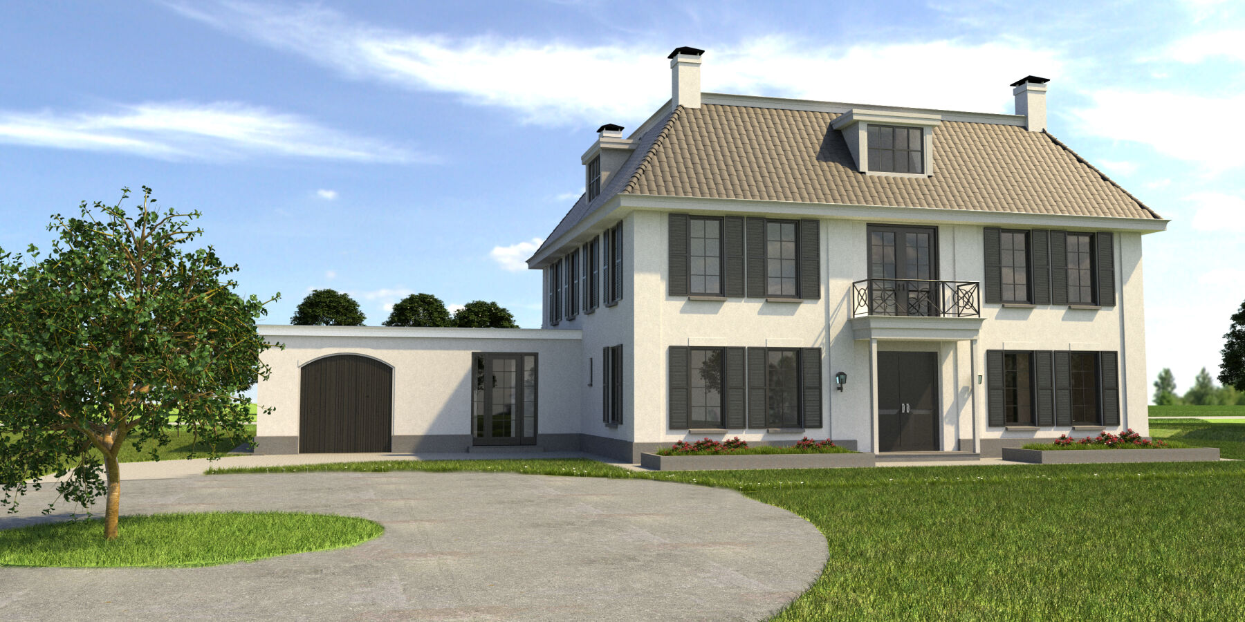 Mede door de hoogte krijgt de woning haar deftige en royale uitstraling. Daarnaast heeft de woning precies in het midden de voordeur met daaromheen symmetrische ramen. De gevel wordt uitgevoerd in wit stucwerk, zwarte kozijnen en hardstenen dorpels.