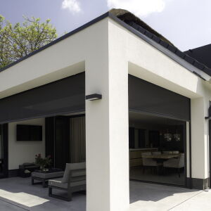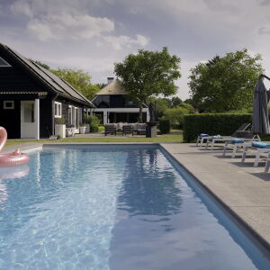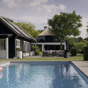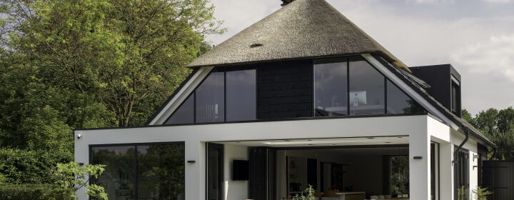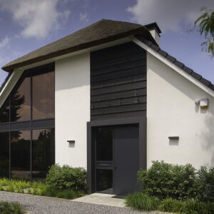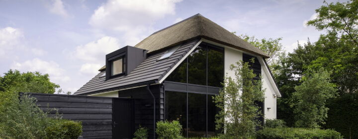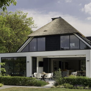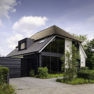 De architectuur van deze villa kenmerkt zich door een combinatie van riet, dakpannen, glas en zwarte planken (potdekselwerk). Op deze wijze sluit de villa naadloos aan op het landschap. De gevels zijn uitgevoerd in wit stukwerk gecombineerd met zwarte houten planken.