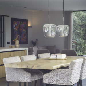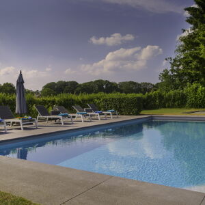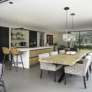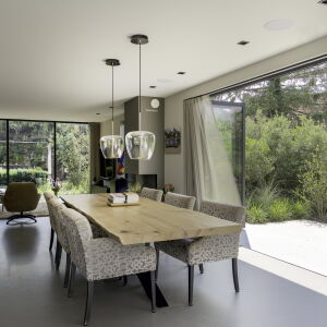 De begane grond bestaat uit één grote leefruimte gekoppeld aan de veranda. Het binnen- en buitenleven kan op deze manier goed worden gecombineerd. Achter de woning bevind zich het royale zwembad.