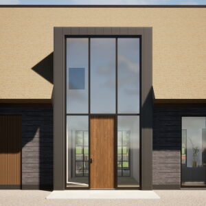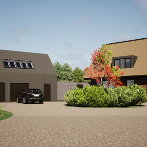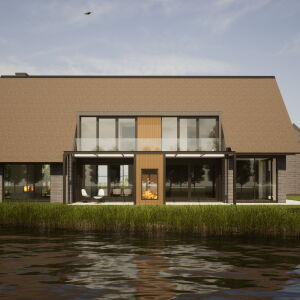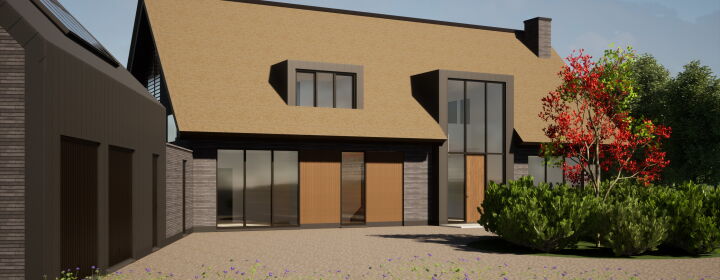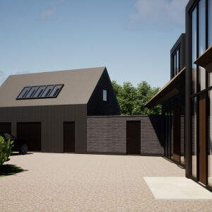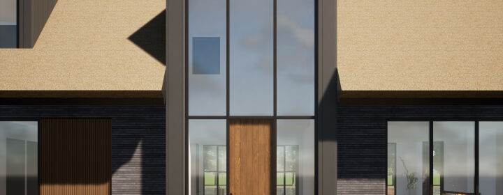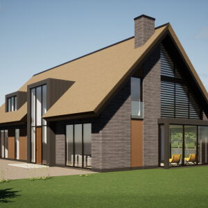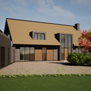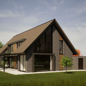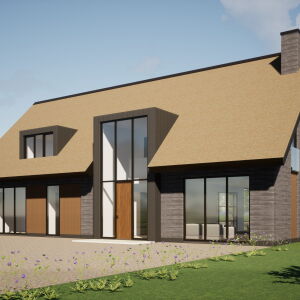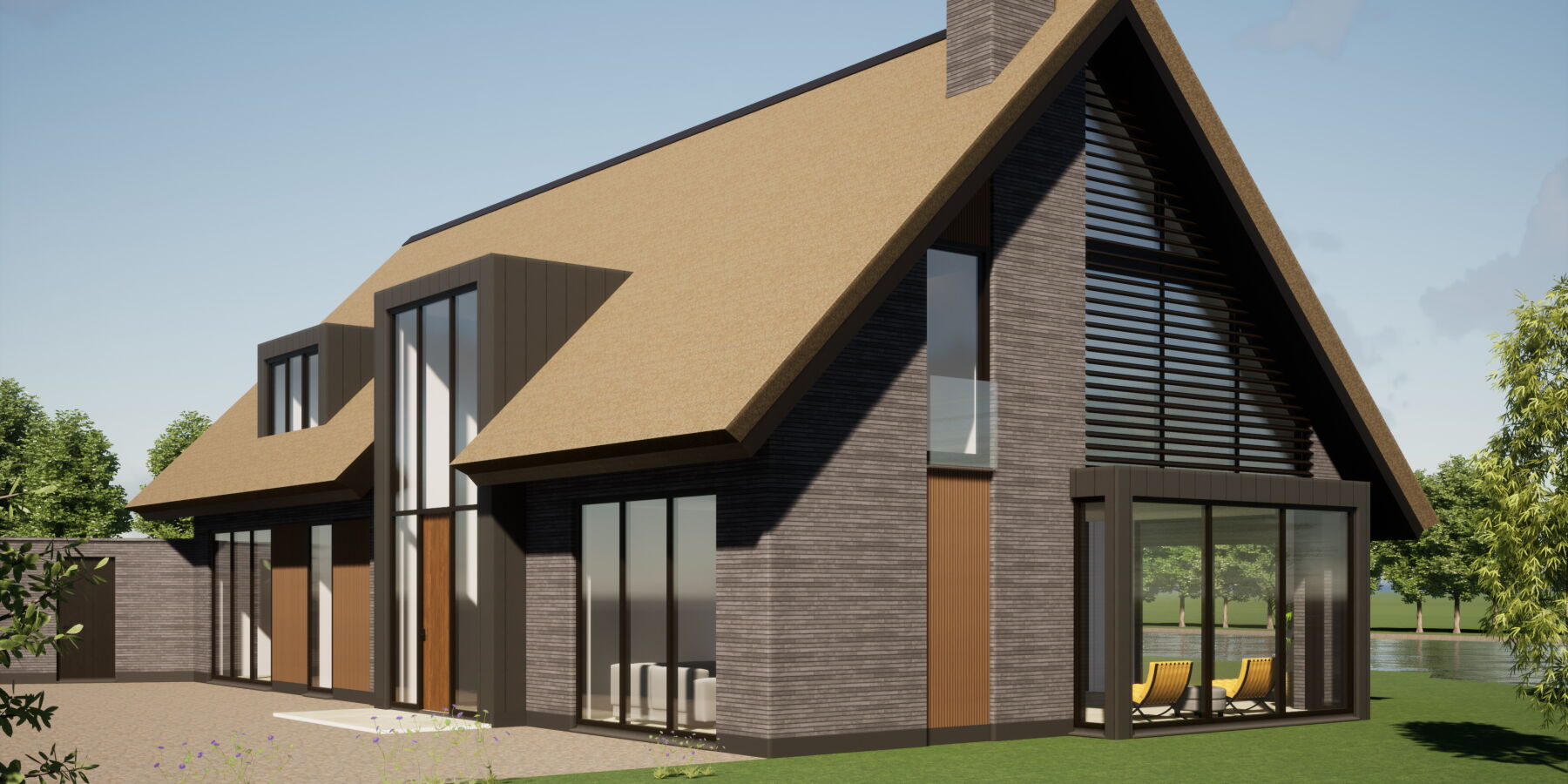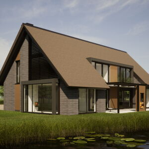 De gevels worden uitgevoerd in een strakke smalle antraciet steen gecombineerd met een rieten. Het dak en gevels van het bijgebouw worden uitgevoerd in donker gepatineerd zink. De entree met de royale vide in de voorgevel is bij aankomst en binnenkomst een ware eyecatcher. Samen met houtcomposiet gevelaccenten heeft de woning een warme en eigentijdse uitstraling.