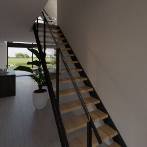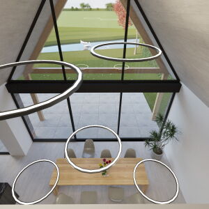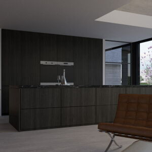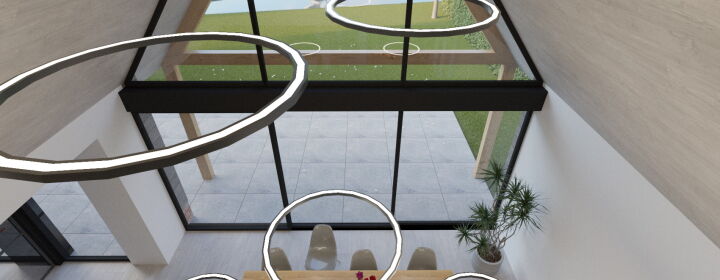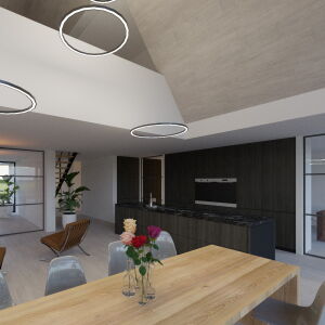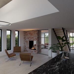 In de woonkeuken bevindt zich de royale vide wat voor een mooie verbinding zorgt met de verdieping. De gevels worden uitgevoerd in wit stukwerk gecombineerd met houten geveldelen en robuust metselwerk. De hoge glaspartijen en de eiken spanten maken van de woning een ware blikvanger.