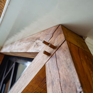 Een echte eyecatcher is de grote glazen gevel aan de achterzijde van de landelijke woning. De grote glaspartij wordt omkaderd door een eiken spant. Vanuit deze kamer heeft men een fantastisch uitzicht op het riviertje in het polderlandschap.