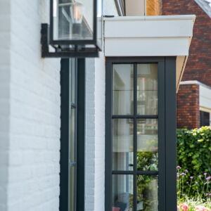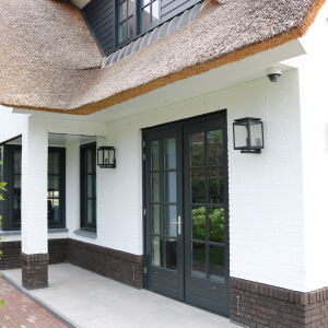 De kozijnen zijn uitgevoerd in zwarte kozijnen, ramen en deuren. Dit vormt een mooi contrast met de witte gevel. Onder de hardhouten kozijnen zijn hardstenen dorpels toegepast. Het ontwerp van deze landelijke woning vormt dan ook een mooi geheel met de omgeving.