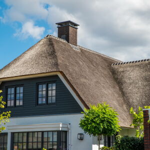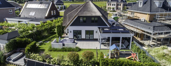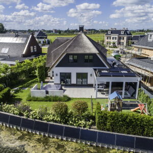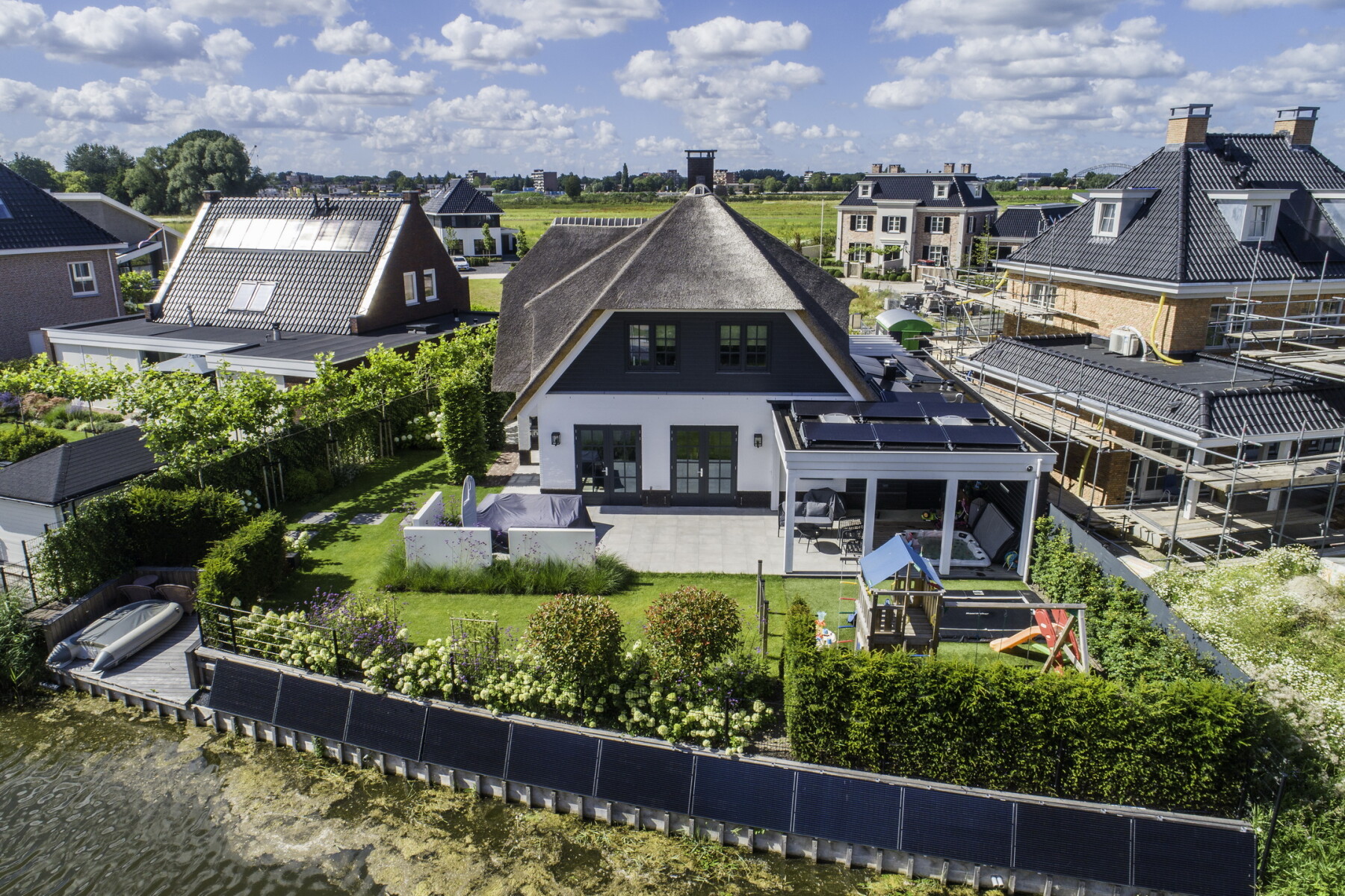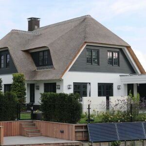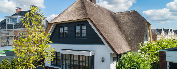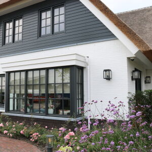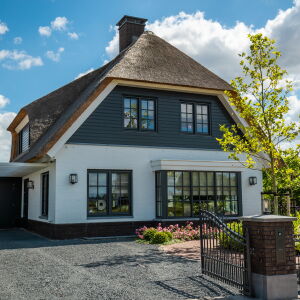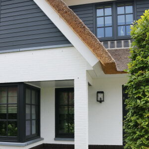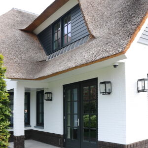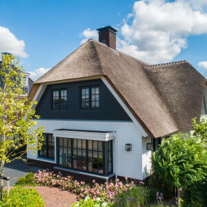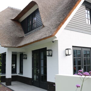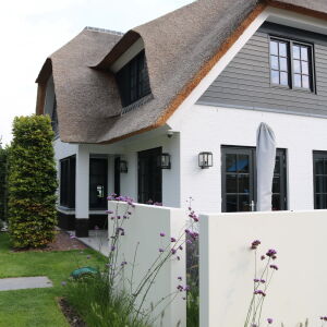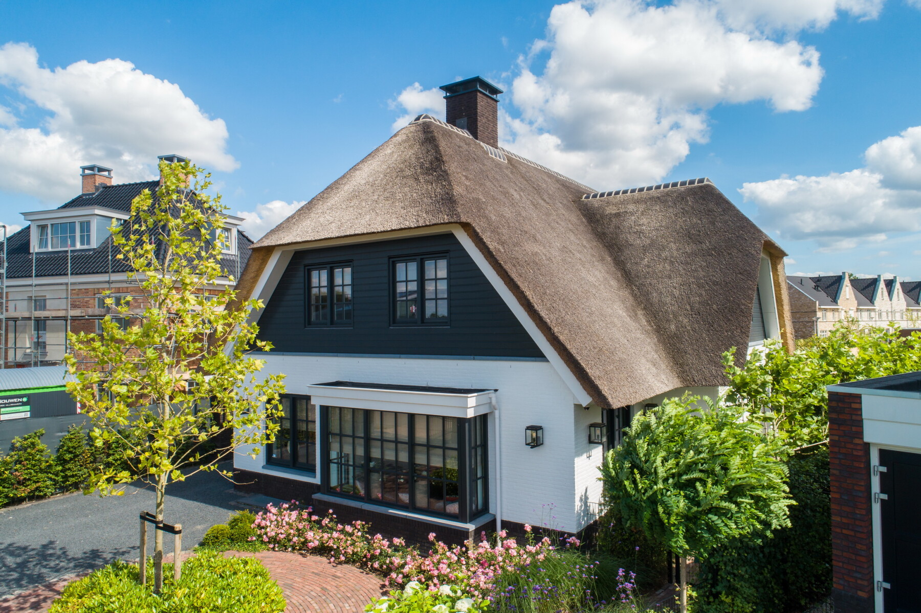 De landelijke architectuur is vertaald naar een grote rieten kap in combinatie met wit gekeimde gevels en zwarte houten delen ook wel potdekselwerk genoemd. Fraaie raampartijen met roeden en hoogwaardige detailleringen completeren het plaatje.