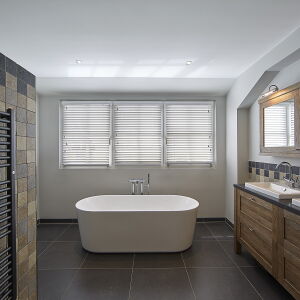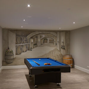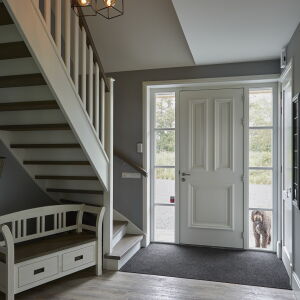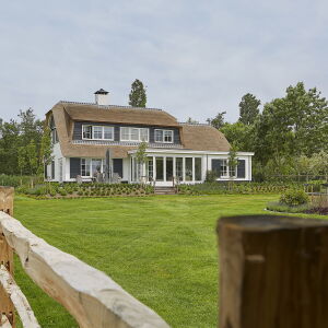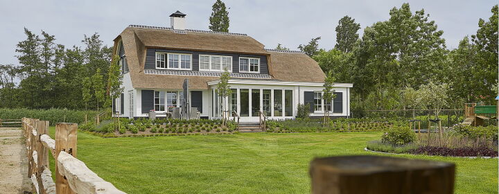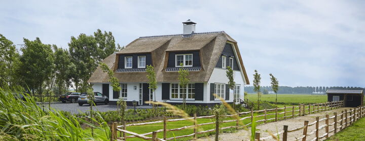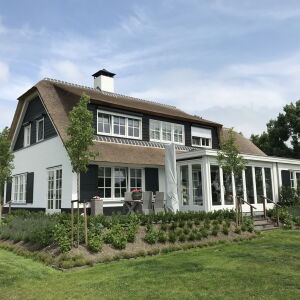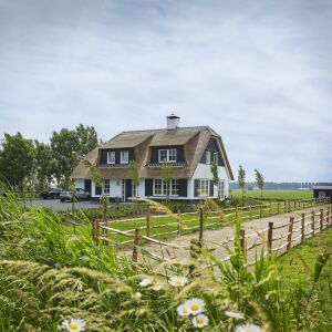 Aan de linkerzijde van de landelijke woning bevindt zich het bijgebouw welke binnendoor bereikbaar is. De woning met haar rieten kap, wit gekeimde gevels en Belgisch hardstenen dorpels heeft een klassieke en landelijke uitstraling welke geheel past in de omgeving.