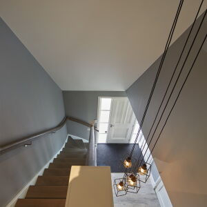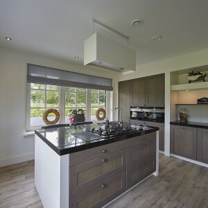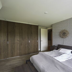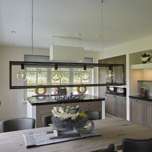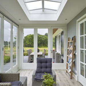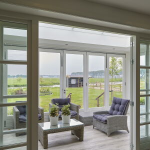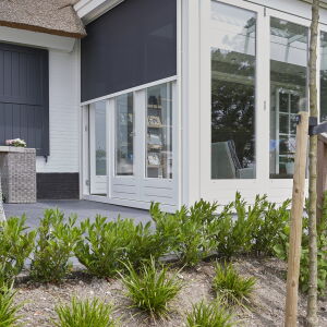 Aan de achterzijde is een tuinkamer ontworpen voorzien van glazen panelen welke in de zomer geheel opengeschoven kan worden waardoor er een veranda ontstaat.