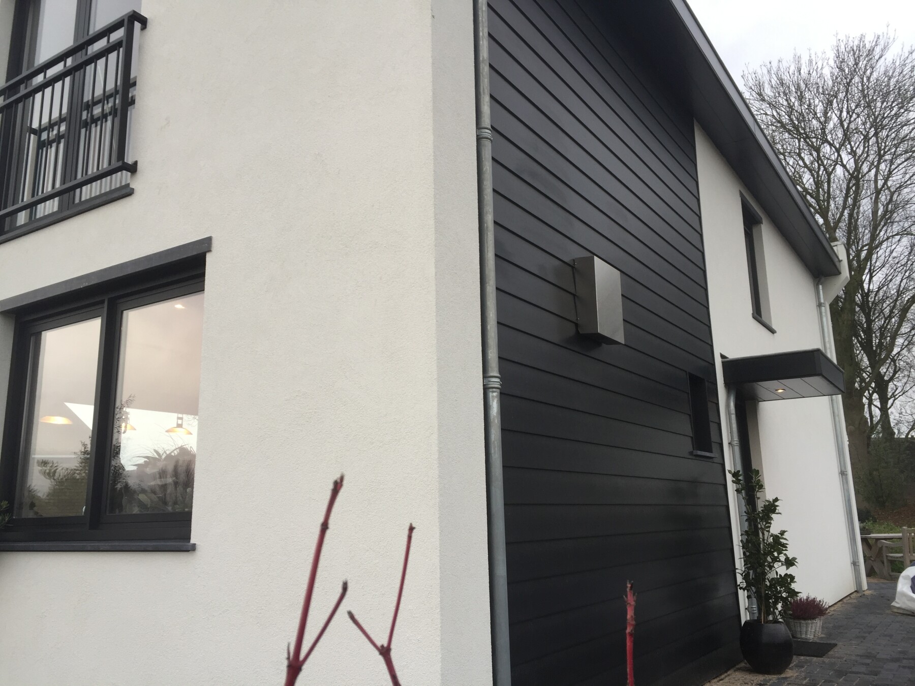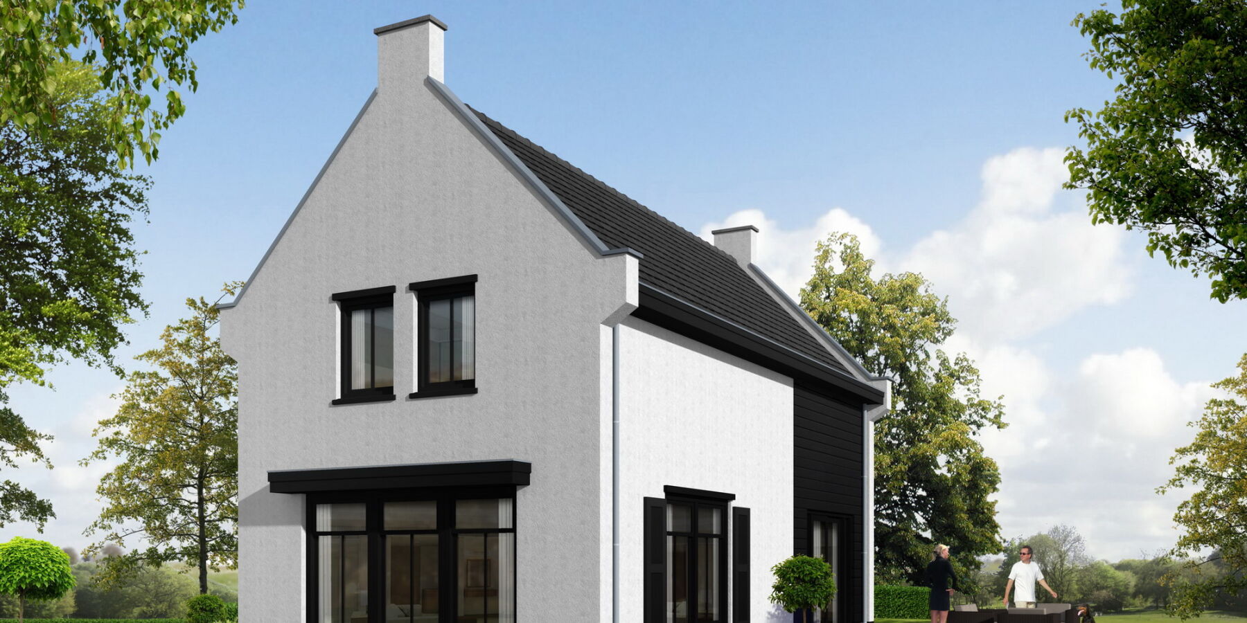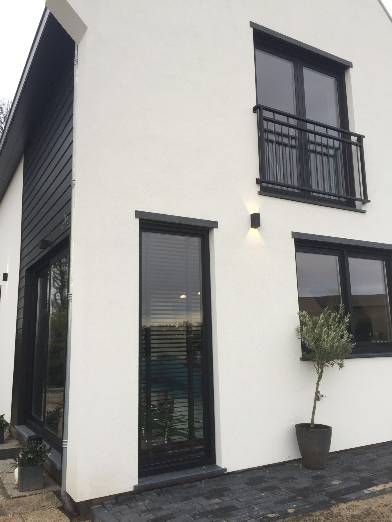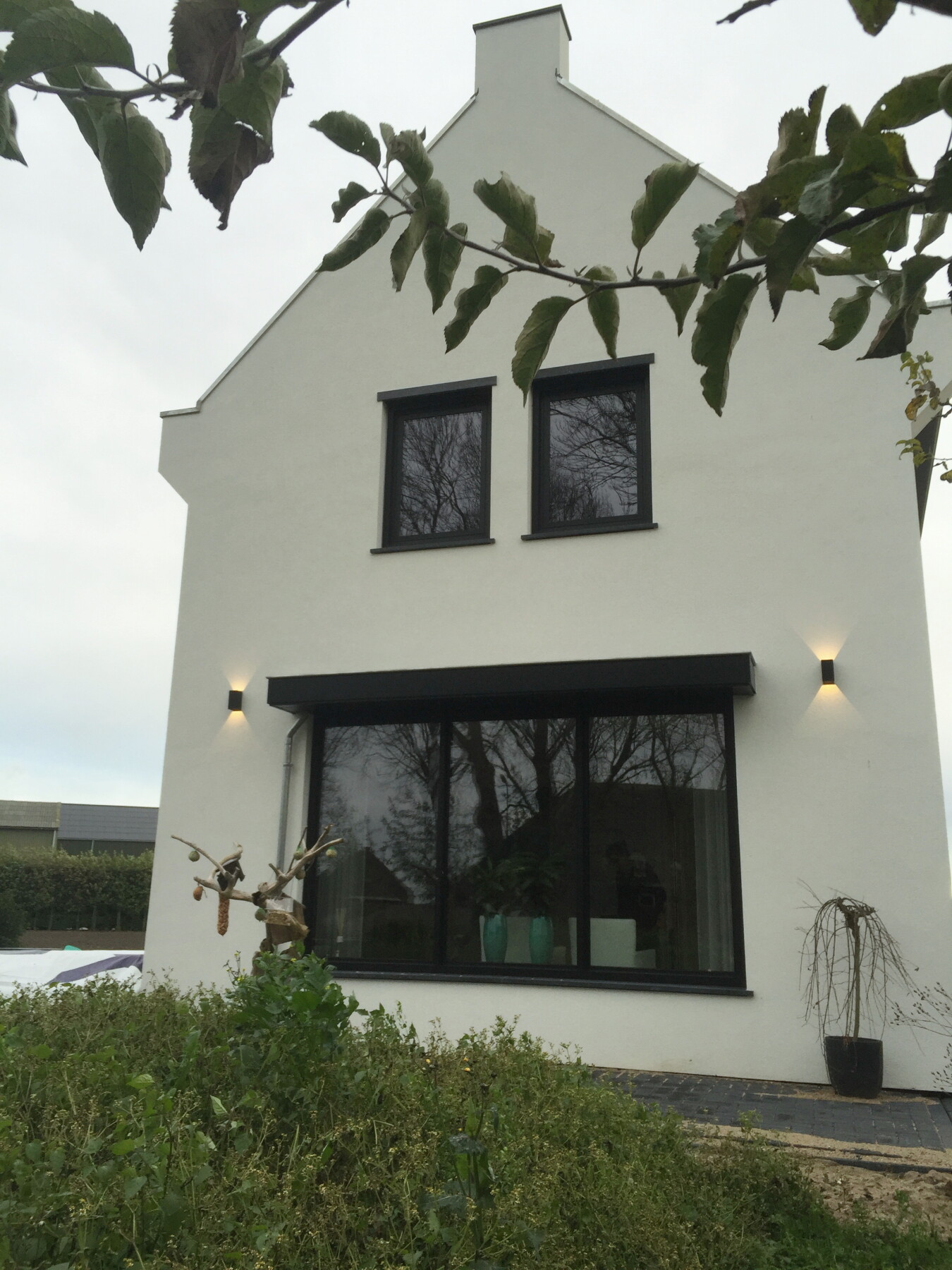 De zwart gekleurde kozijnverdeling is in de wit gestucte gevels gepositioneerd en geeft het geheel een moderne uitstraling. Samen met het zwarte potdekselwerk vormt dit een prachtig contrast met de witte gevels.