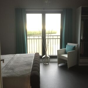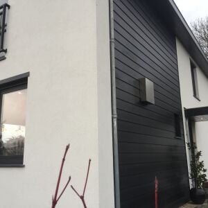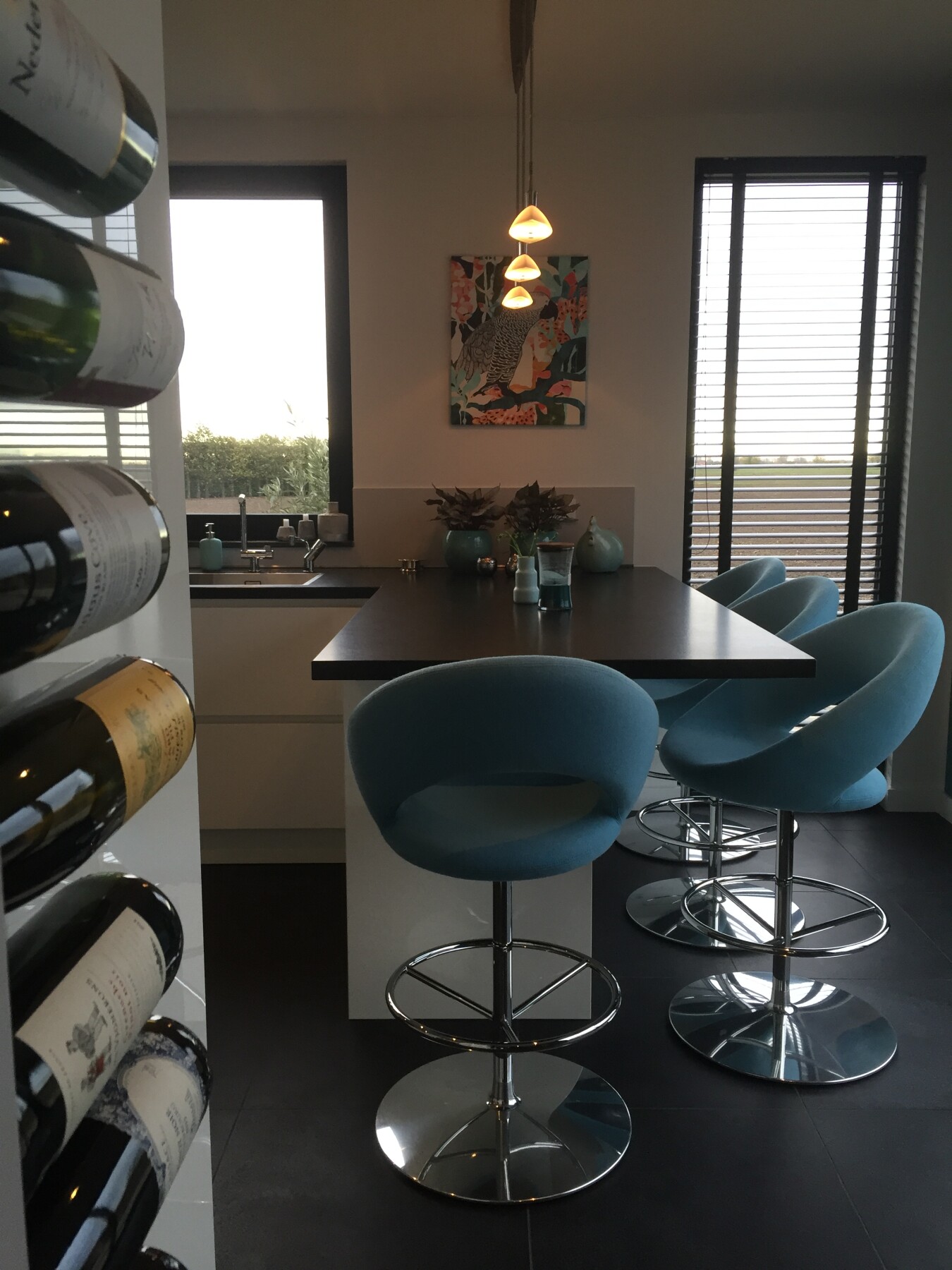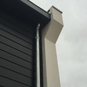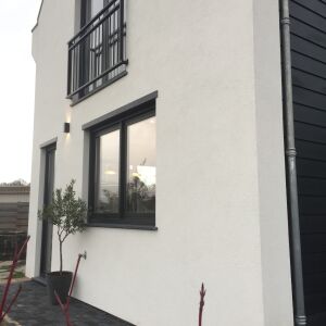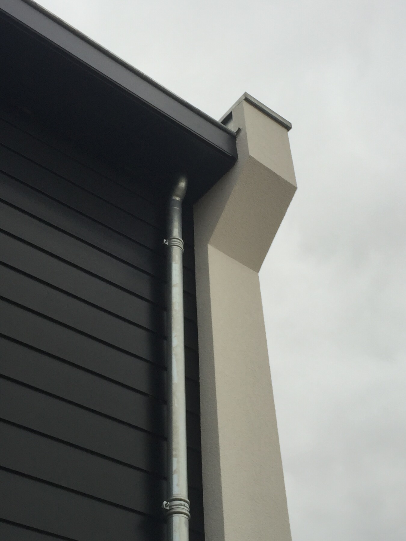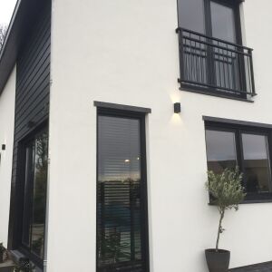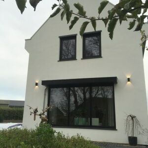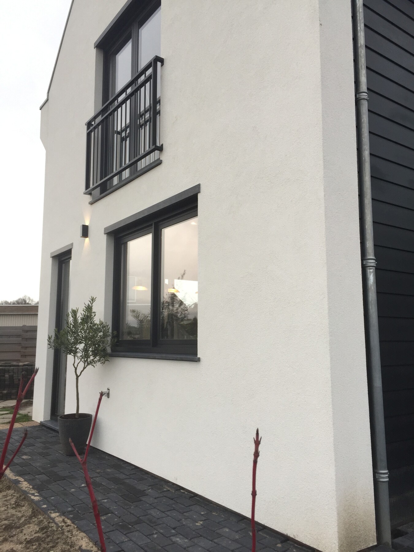 De zwart gekleurde kozijnverdeling is in de wit gestucte gevels gepositioneerd en geeft het geheel een moderne uitstraling. Samen met het zwarte potdekselwerk vormt dit een prachtig contrast met de witte gevels.