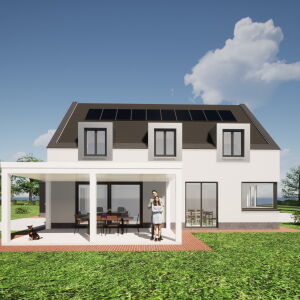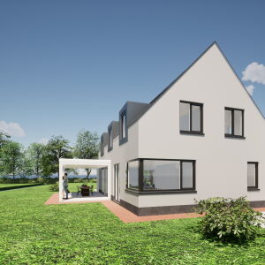 De woning is uitgevoerd met strakke antraciet dakpannen, wit gestuukte gevels en antraciet dorpels. De woning heeft een landelijke uitstraling welke geheel past in de omgeving.