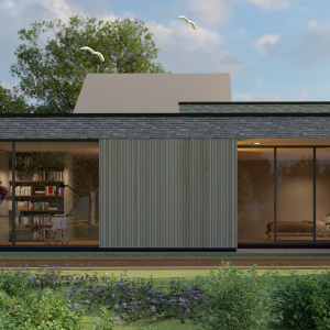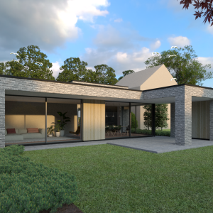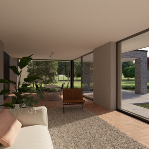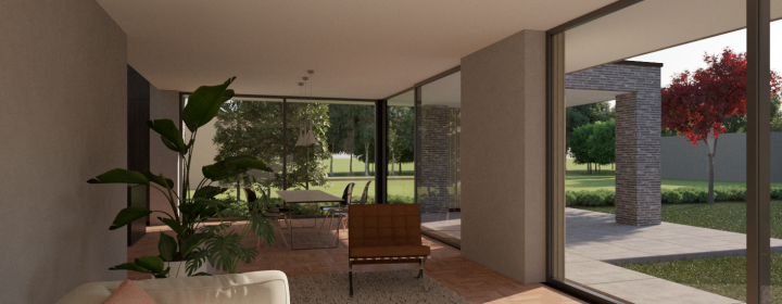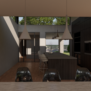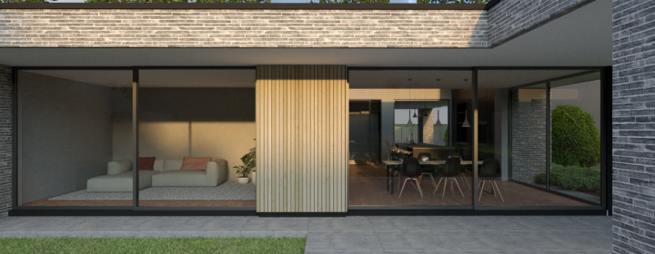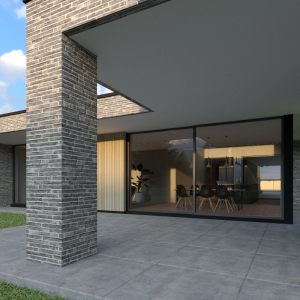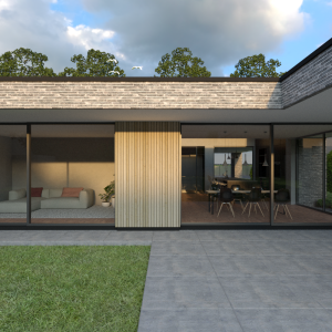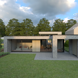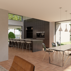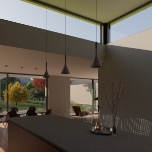 Door de grote op het zuiden gerichte schuifpuien wat terug in de gevel te leggen ontstaat er een mooie schaduwwerking. Boven de royale woonkeuken is het dak als het ware omhoog getrokken wat bijdraagt aan een mooie lichtinval in zowel de woonkeuken als de living.