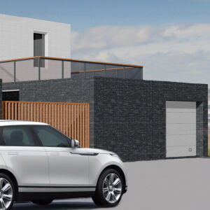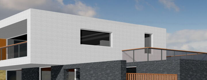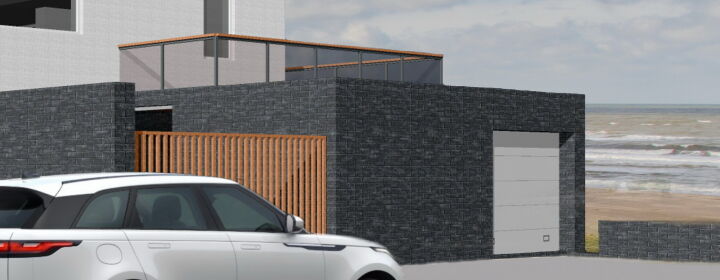 Het balkon aan de voorzijde heeft grote terug liggende verdiepingshoge glazen puien om zoveel mogelijk daglicht in de woning te creëren. Door de puien terug liggend te positioneren wordt er een natuurlijke zonwering gecreëerd en een aangenaam klimaat op het terras bewerkstelligd. Aan de achterzijde bevind zich het dakterras waar de bewoners kunnen genieten van de zee en ondergaande zon.