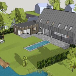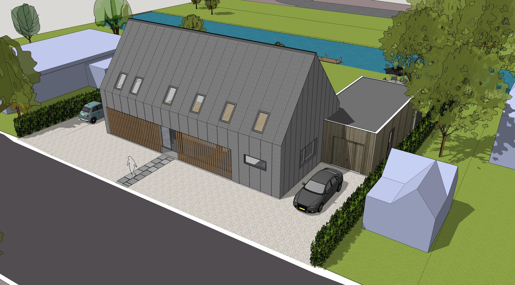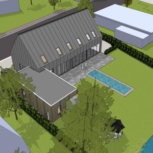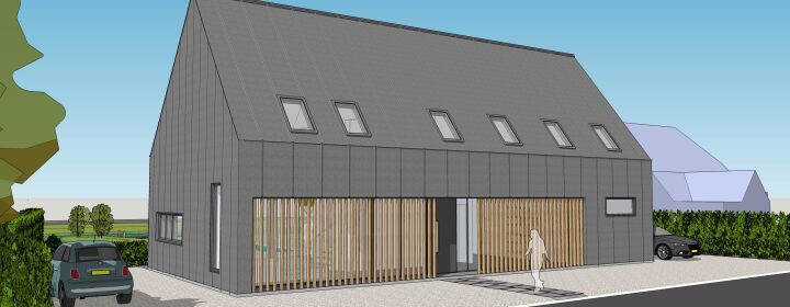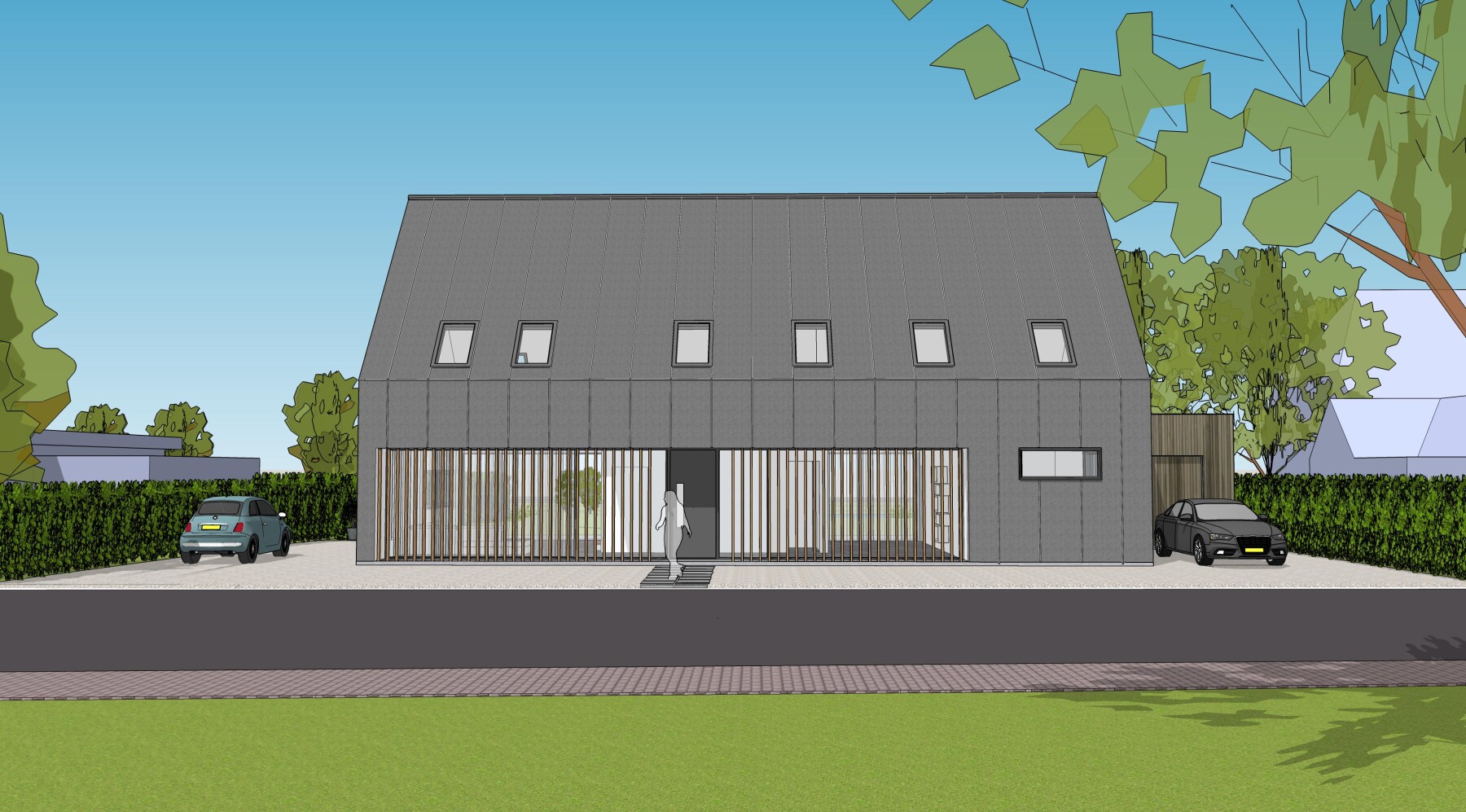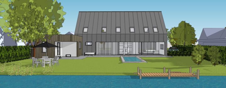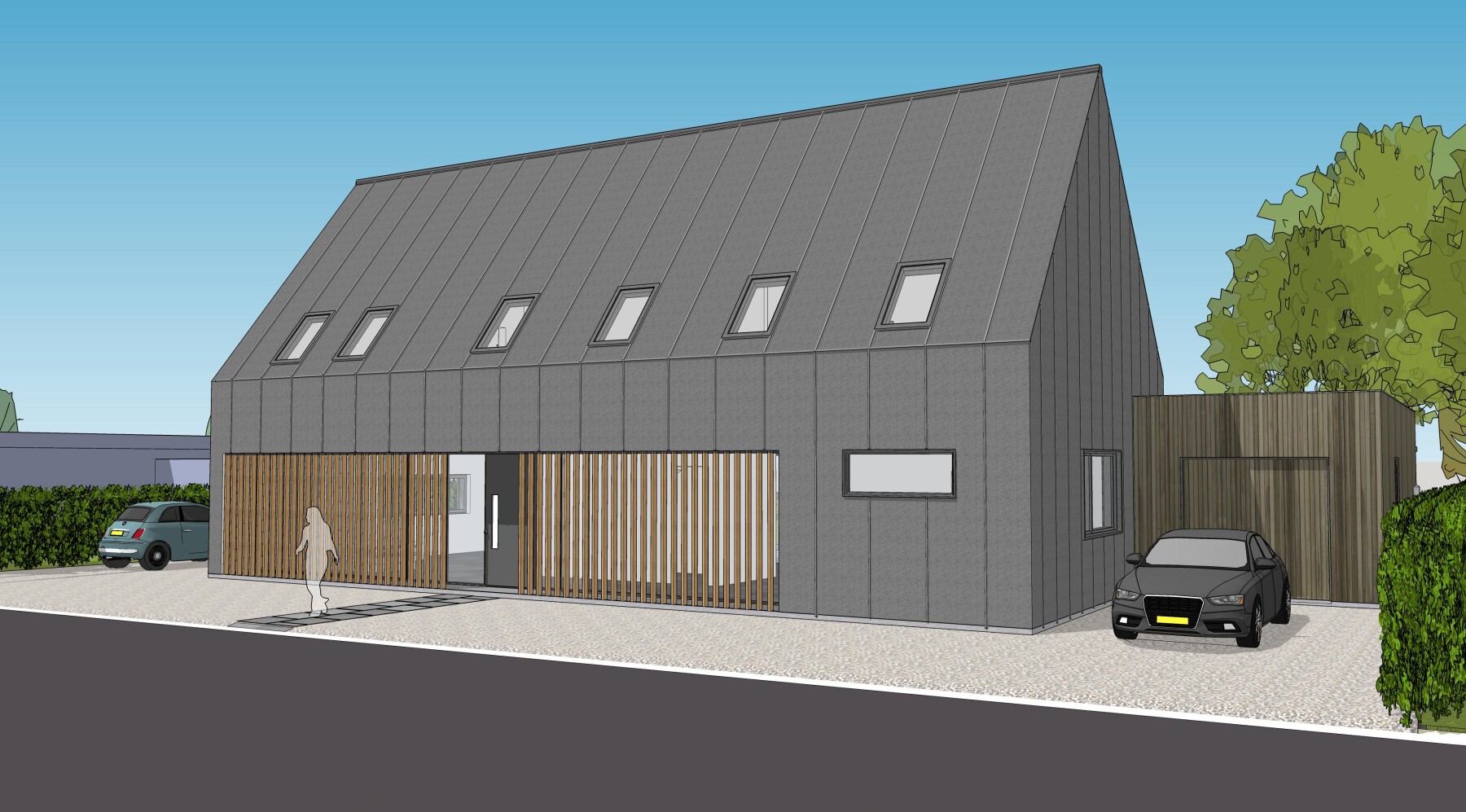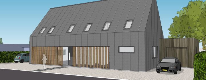 Het bijgebouw is voorzien van een warme houten gevelbekleding dat op een zelfde wijze accentueert met het zink van de woongevels.
