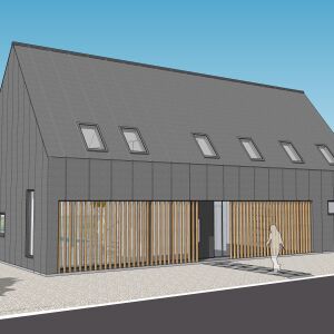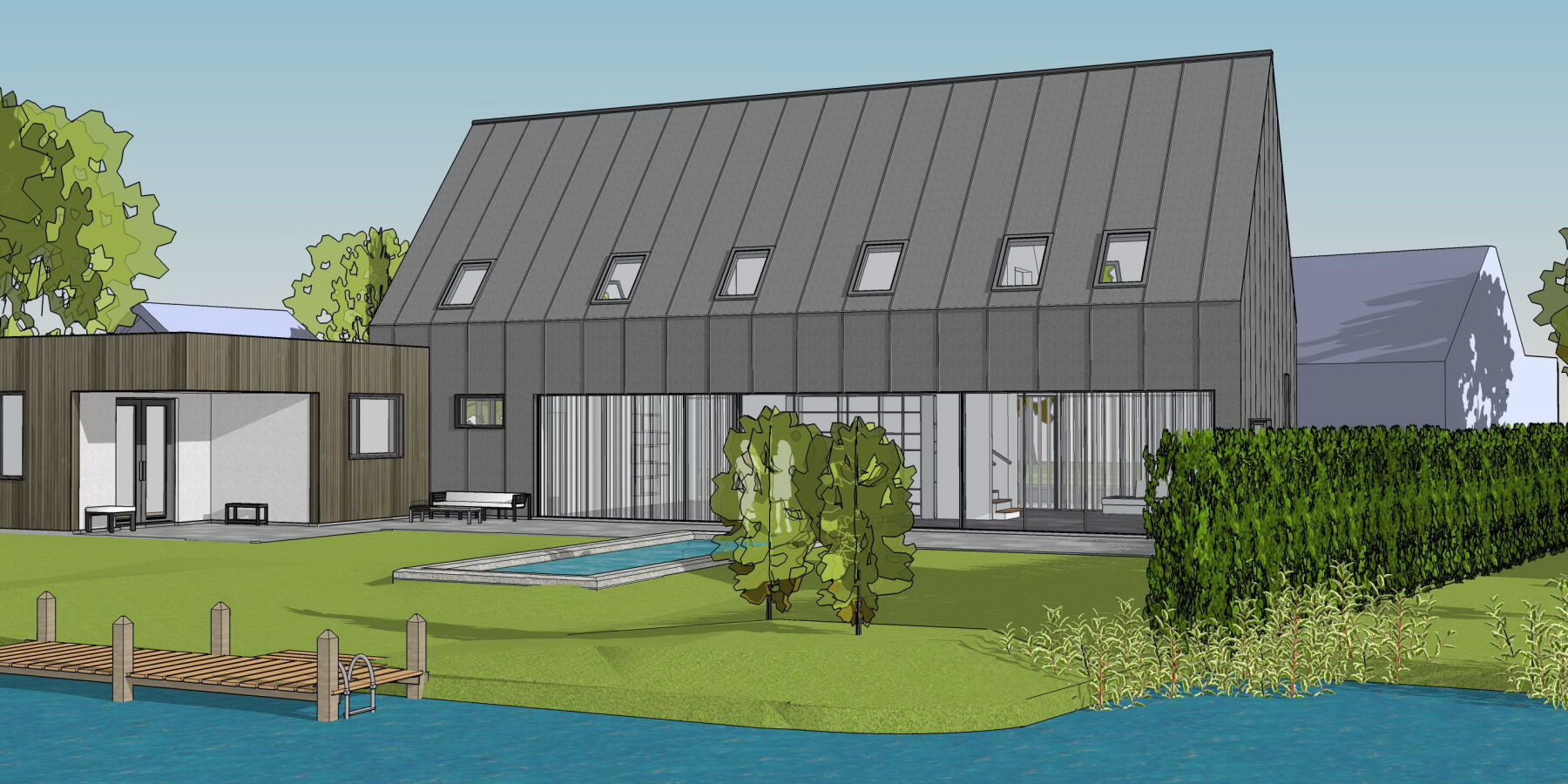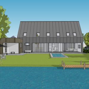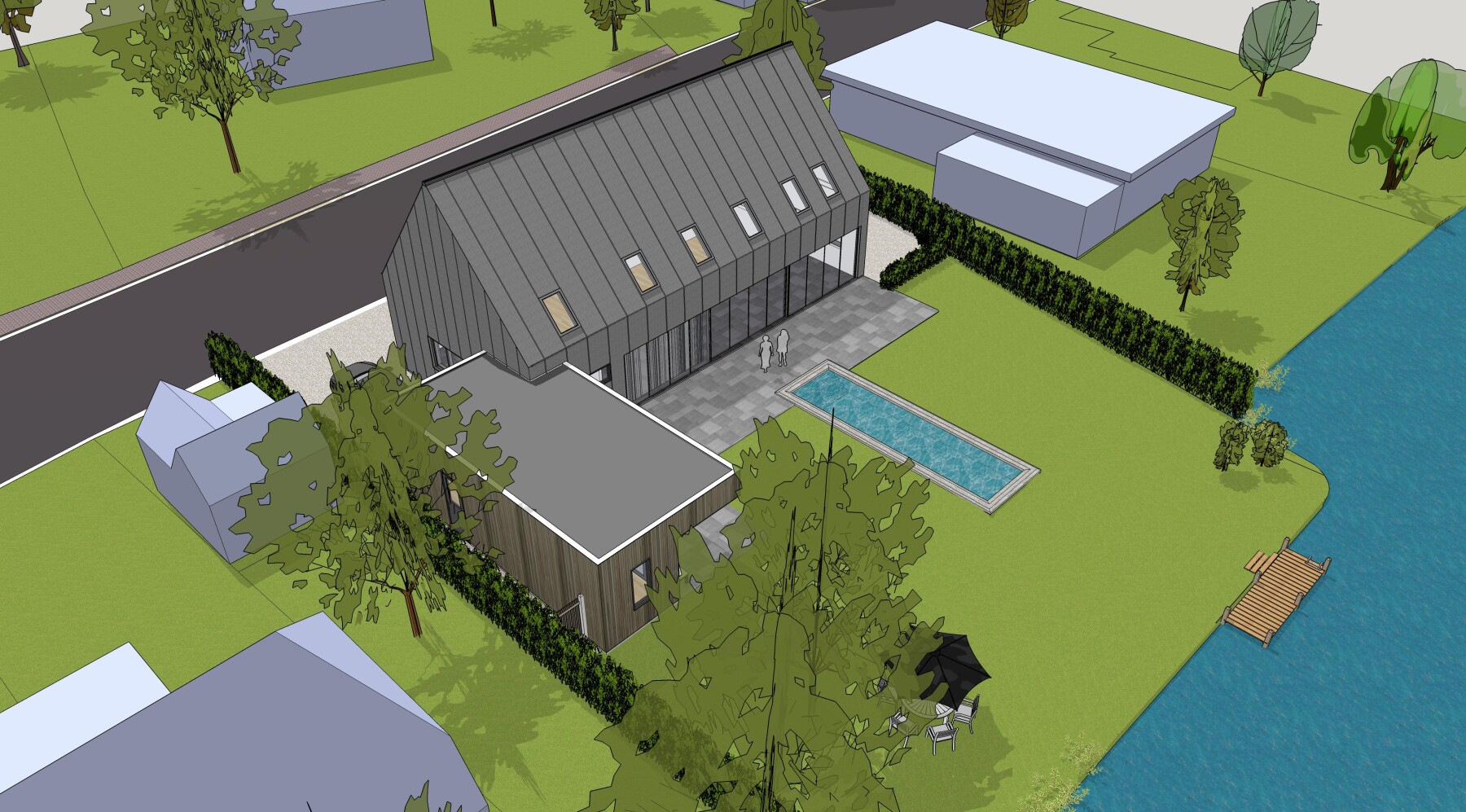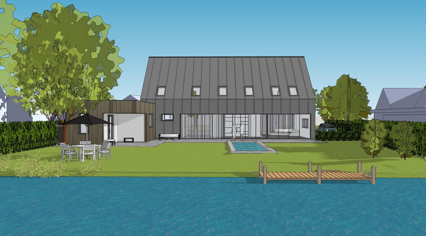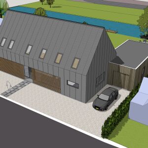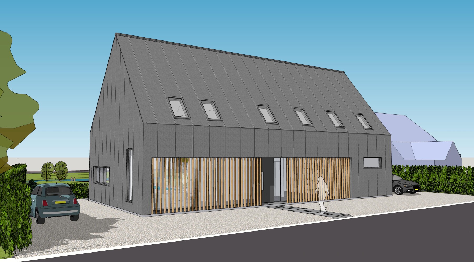 Het bijgebouw is voorzien van een warme houten gevelbekleding dat op een zelfde wijze accentueert met het zink van de woongevels.