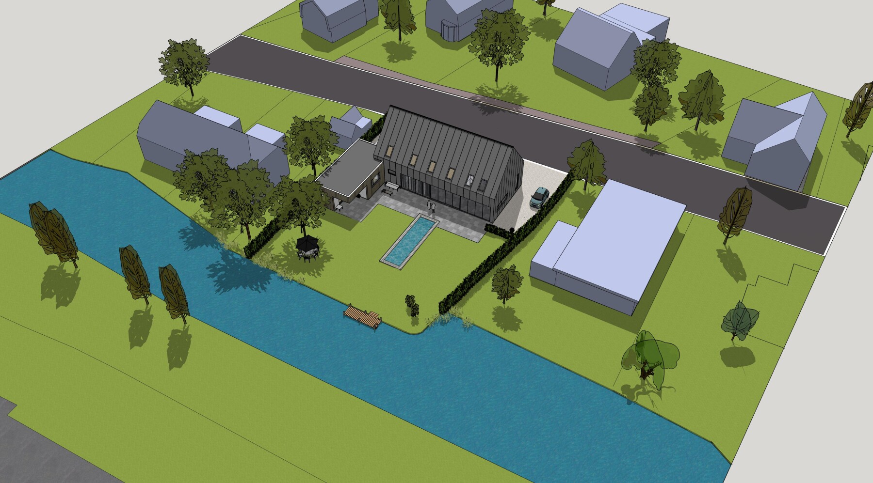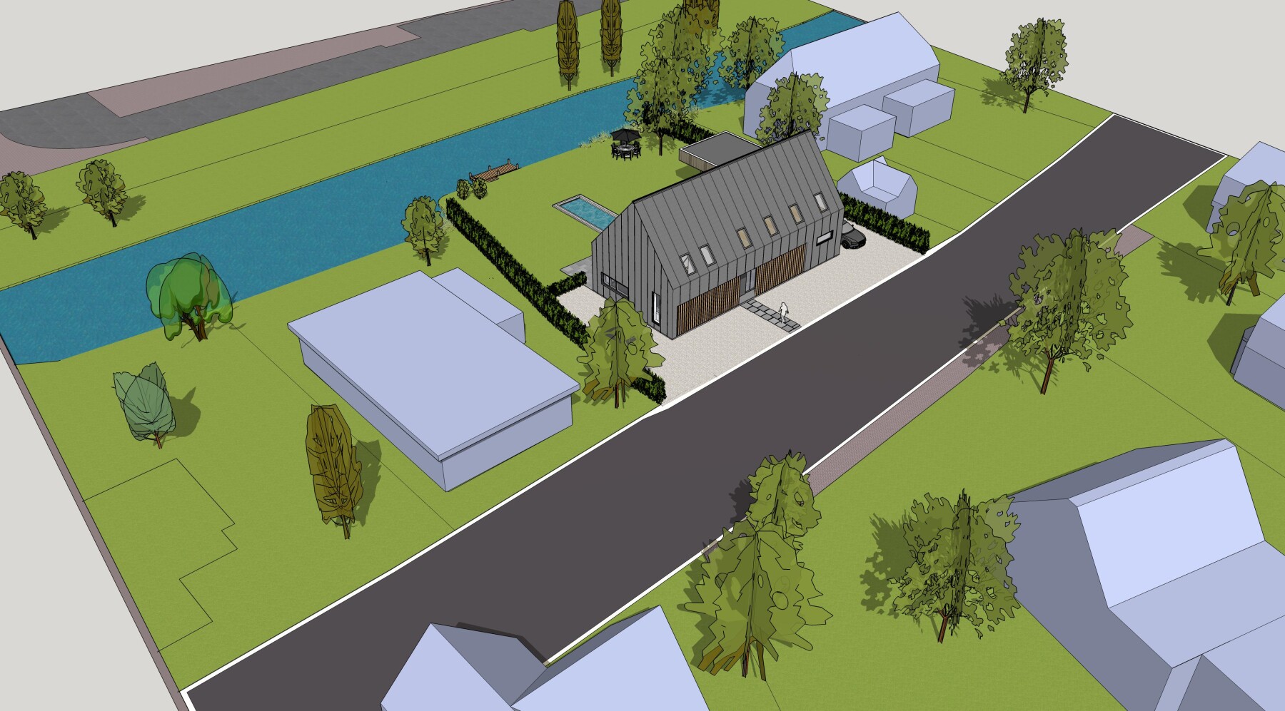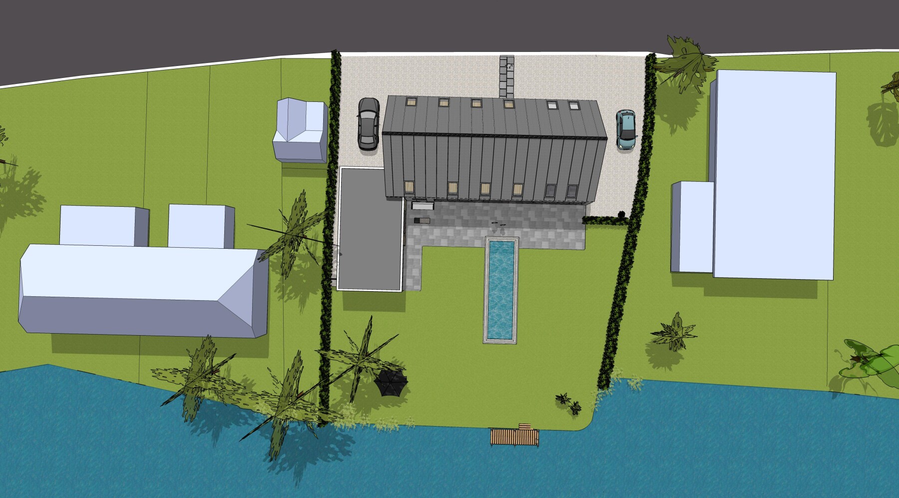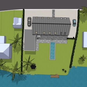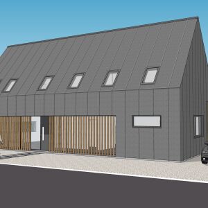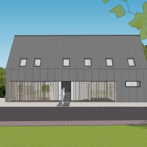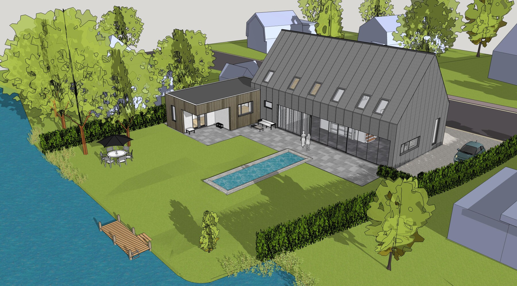 Het bijgebouw is voorzien van een warme houten gevelbekleding dat op een zelfde wijze accentueert met het zink van de woongevels.