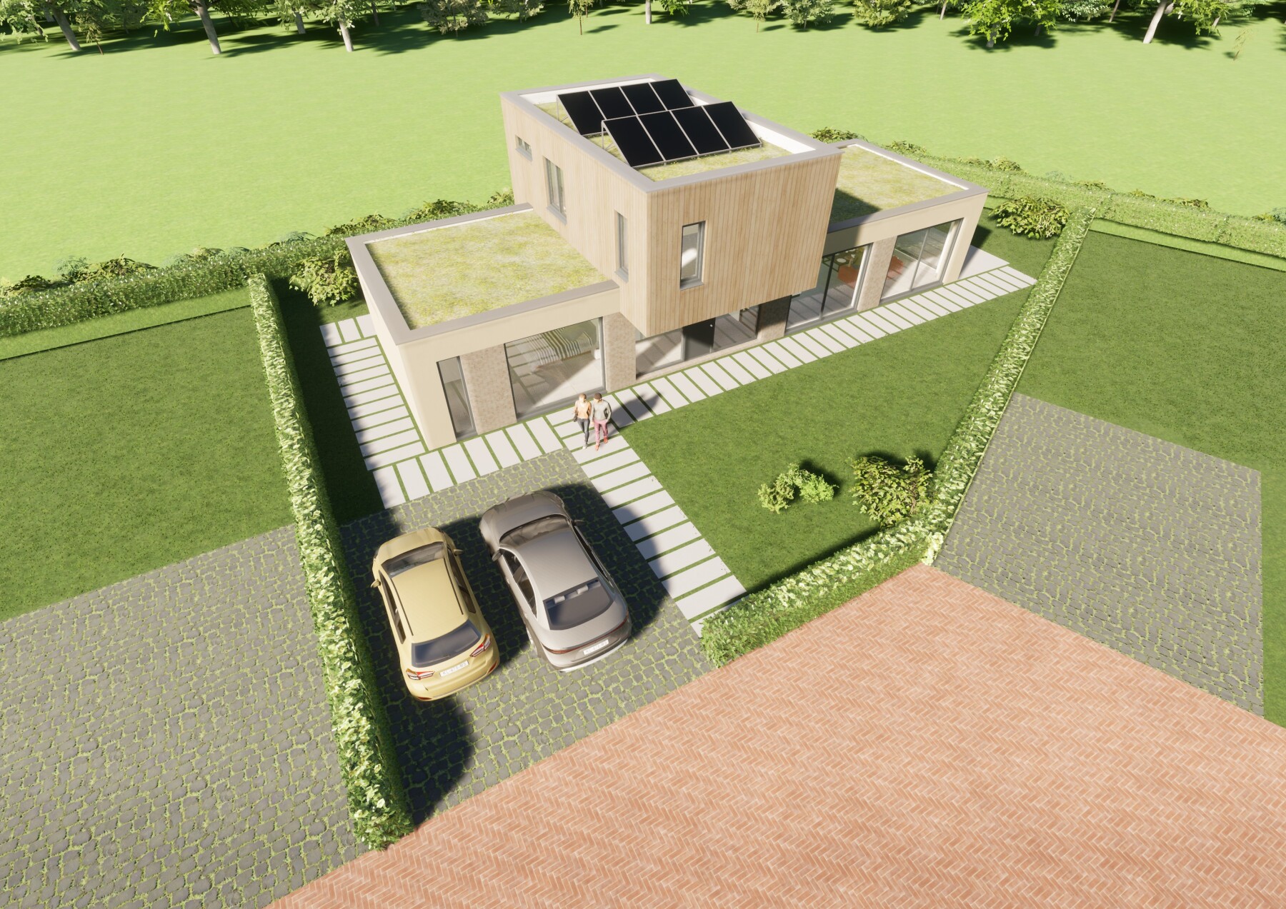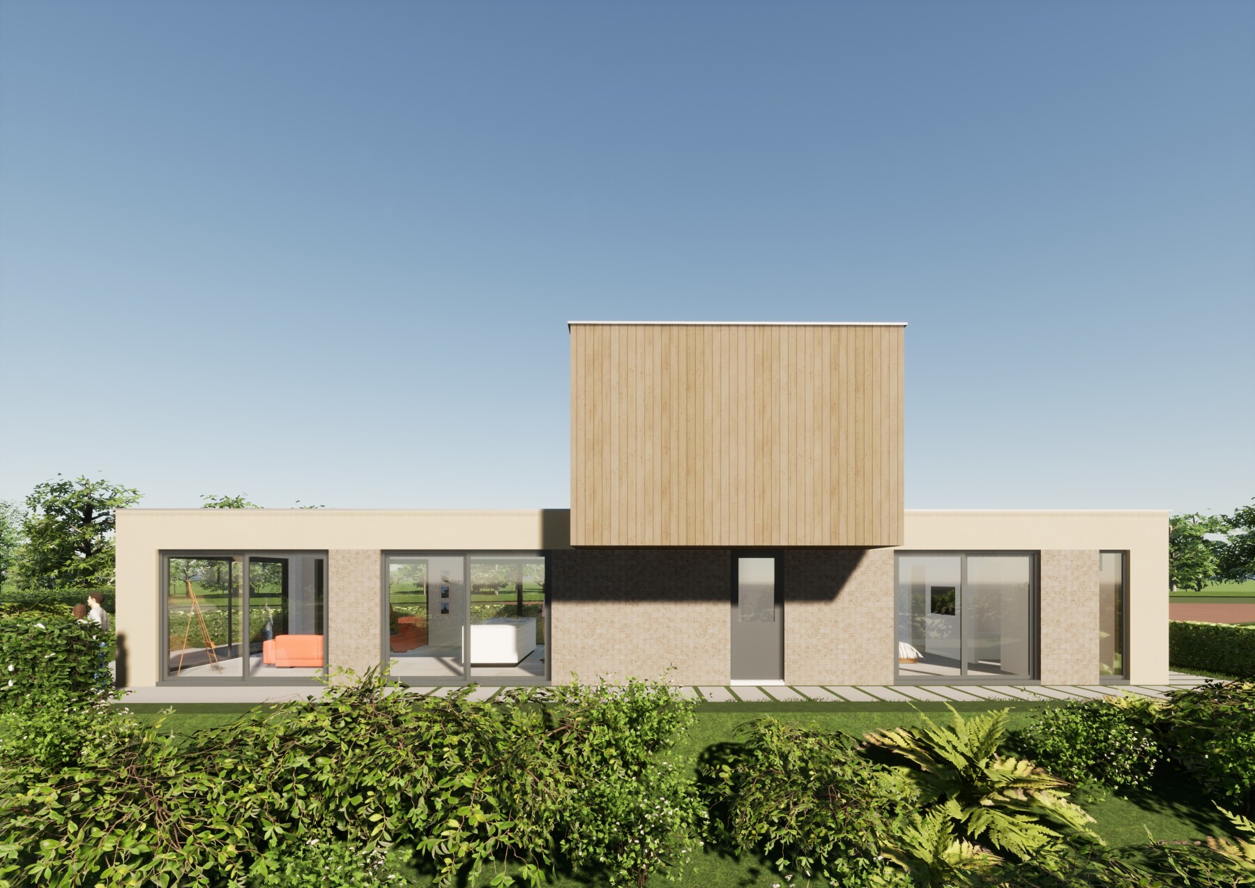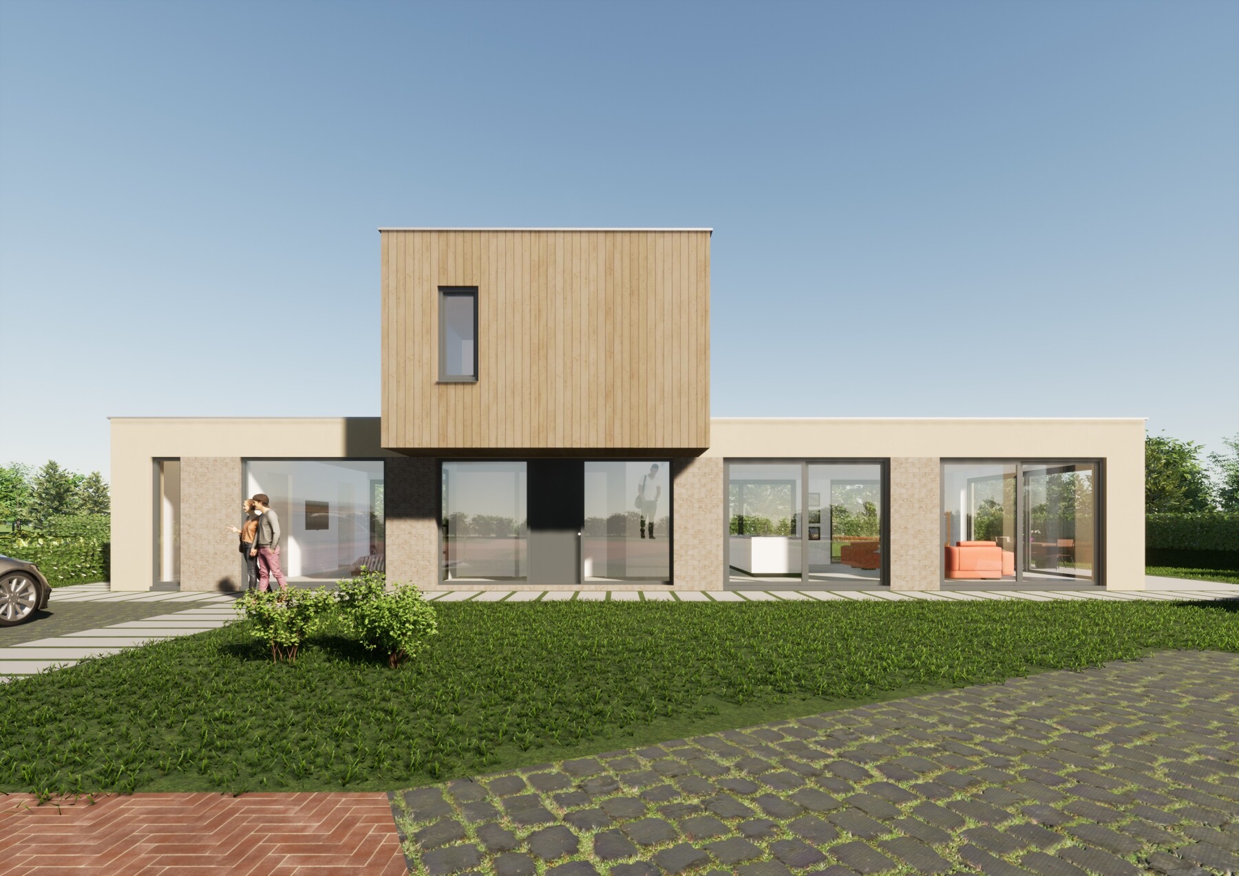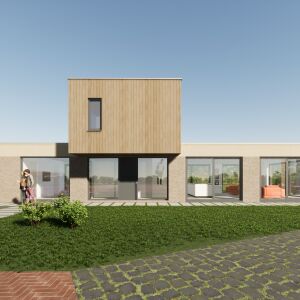 De gevels worden opgebouwd met het circulair gevelsysteem van Terca Clickbrick. Het metselwerk wordt omkaderd door natuurlijk kalkstuc wat direct op kleur is gebracht. De gevel van de verdieping is uitgevoerd met duurzaam gemodificeerd hout. Het dak wordt voorzien van zonnepanelen en uitgevoerd als een groen dak.