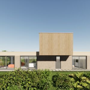 De bungalow bestaat uit een samengesteld volume van twee bouwlagen. Het moderne ontwerp is ingetogen waarbij er een zorgvuldige verhouding is tussen de open en dichte geveldelen. De royale living wordt omringt door de tuin en is voorzien van grote glaspartijen waardoor de tuinbeleving optimaal is.