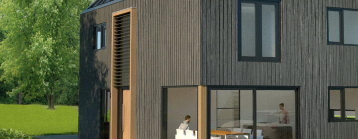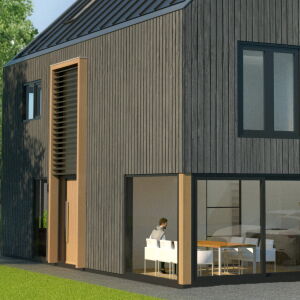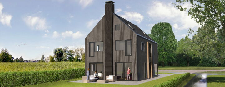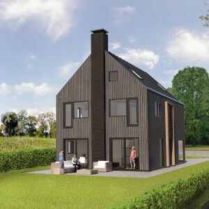 De woning wordt uitgevoerd met een zinken dak en houten verticale gevelplanken. De verticale entree met de eikenhouten kolommen en lamellen is een echte eyecatcher. Ook ter plaatse van de hoekkozijnen komen de houten kolommen terug. Dit geeft de woning een geheel eigentijds en uniek karakter. De woning is royaal van opzet met op de begane grond een ruime living en een aparte woonkeuken. Op de eerste verdieping bevinden zich 4 slaapkamer en een royale badkamer. Op de zolder kunnen nog een tweetal slaapkamers gerealiseerd worden.