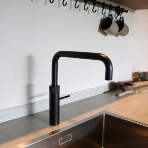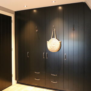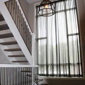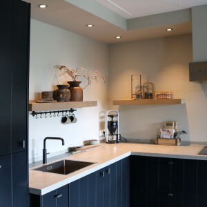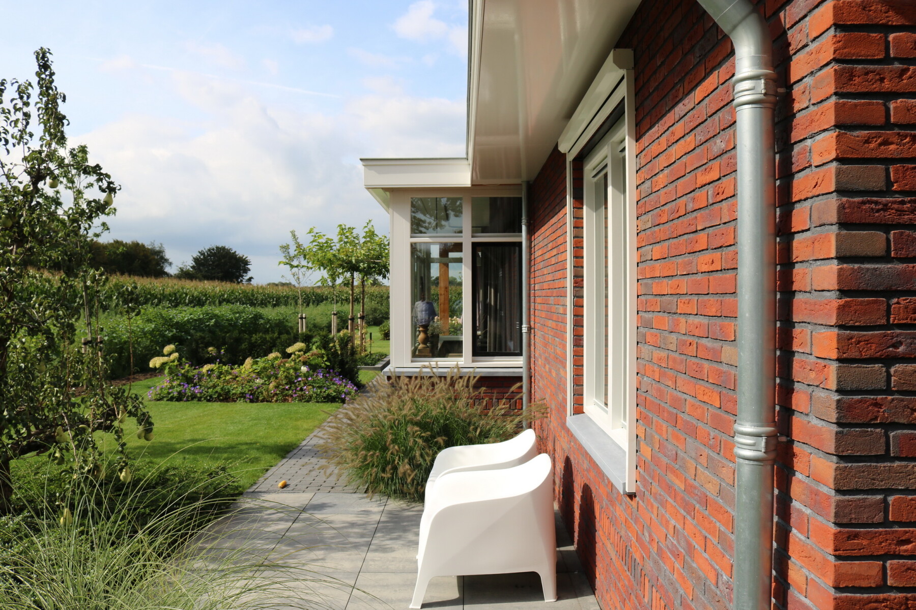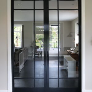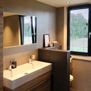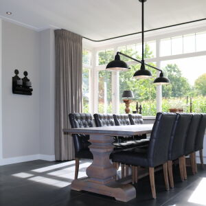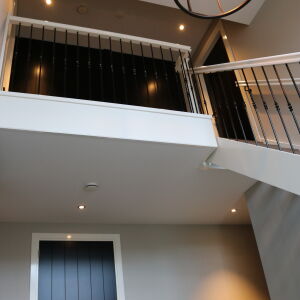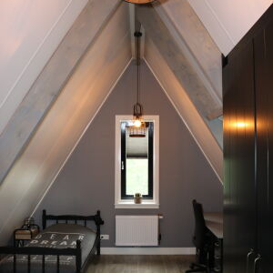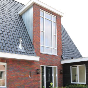 De verticale entreepartij met zinken bekleding is een echte eyecatcher geworden. Ook op de verdieping brengt het grote kozijn veel licht naar binnen. De ruime living wordt middels twee openslaande zwarte houten glazen deuren gescheiden van de royale eetkeuken. In de erker is de eettafel geplaatst zodat er volop genoten kan worden van de omliggende tuin en het weidse landschap.