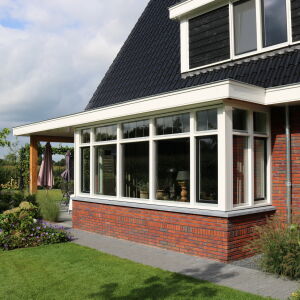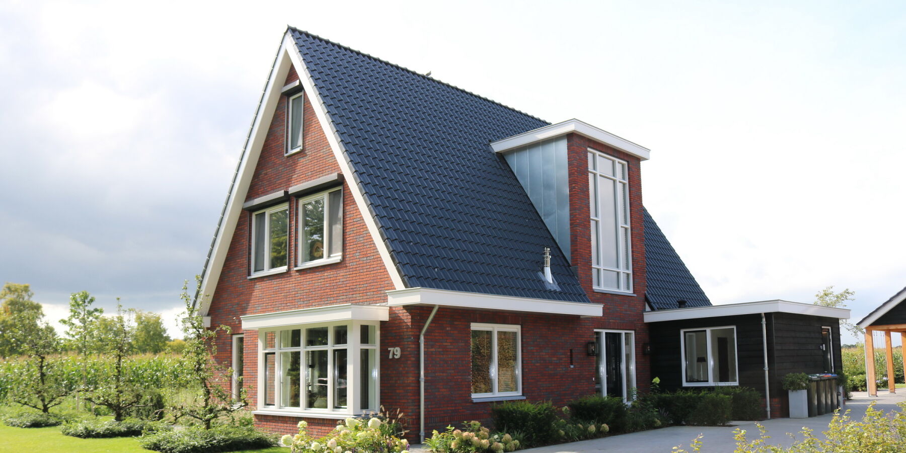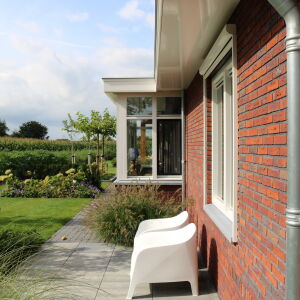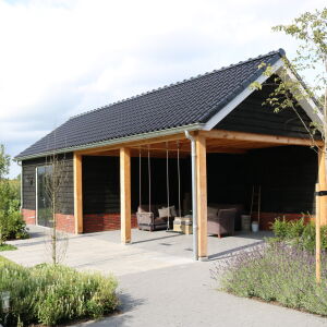 Rechts van de woning is een berging met veranda ontworpen. De berging is opgebouwd uit zwarte planken, ook wel potdekselwerk genoemd wat een mooi geheel vormt met de eiken kolommen.
