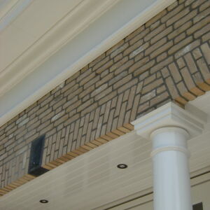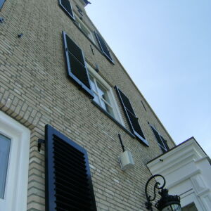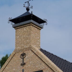 Opvallende details in de gemetselde gevels vormen de getoogde rollagen boven de ramen en deuren en de robuust gemetselde randafwerking langs het hellende dak. De boerenvlechting in de topgevel zorgt voor extra nuances in de toch al fraaie gevel, zoals ook de Louvre luiken accenten geven aan de