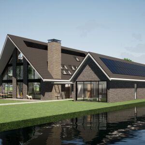 Een echte eyecatcher is de grote glazen gevel van waaruit de bewoners een schitterend uitzicht hebben op de tuin en het water. Door de verspringende gevelpartijen en eiken houten spanten ontstaat er een gevarieerd en spannend gevelbeeld. Een bijzonder kenmerk van deze woning is de kap welke schuin wegloopt naar de nok.