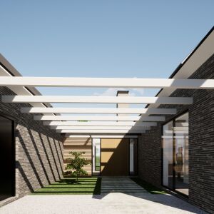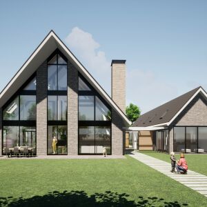 De architectuur van deze villa kenmerkt zich door een combinatie van zwarte leipannen, karakteristieke metselwerk gevels, met grote glaspartijen en eiken spanten.