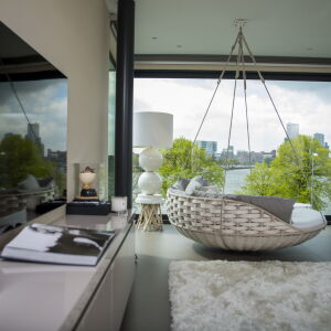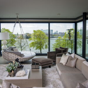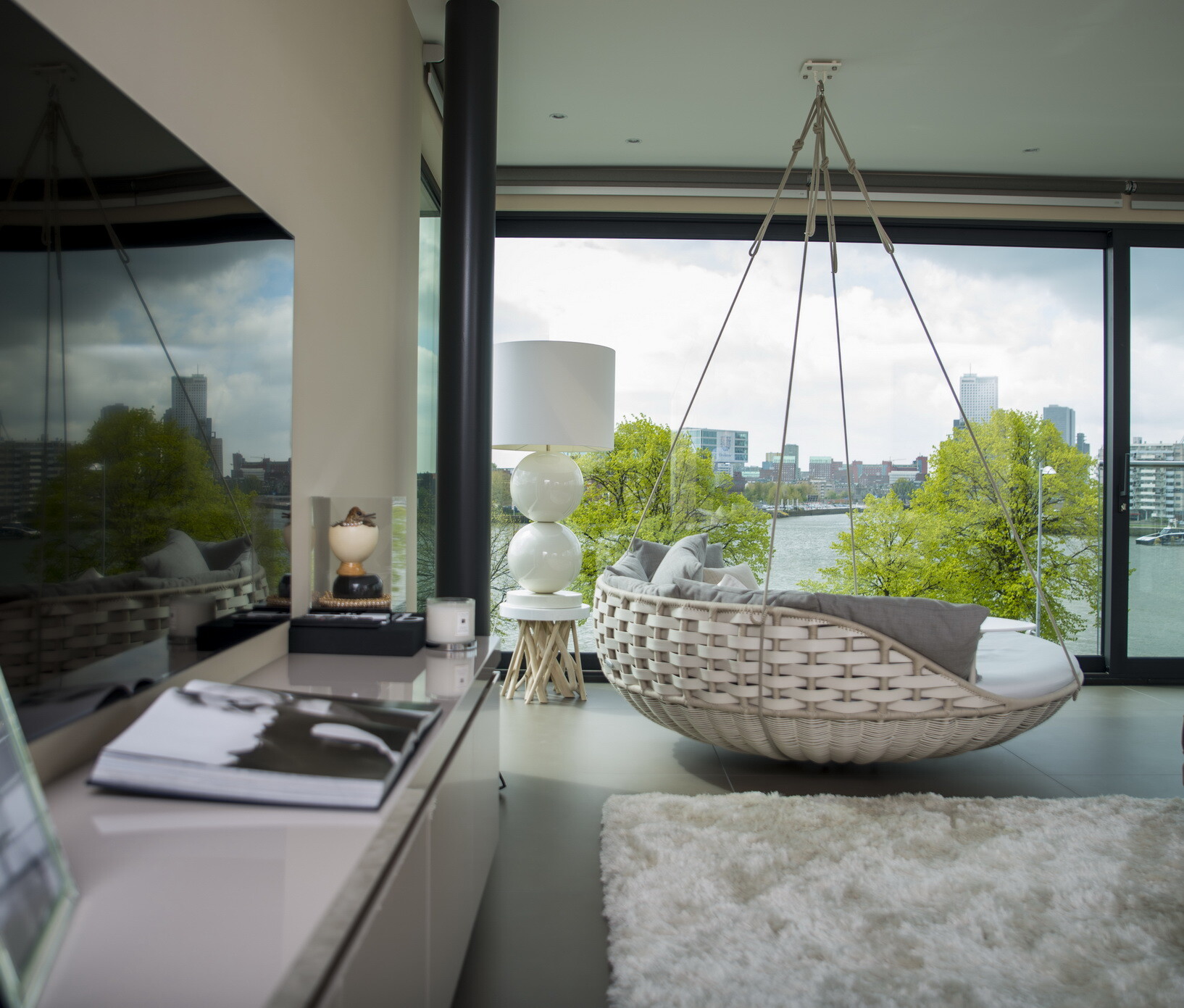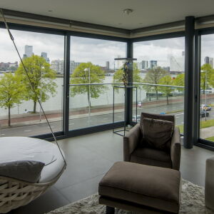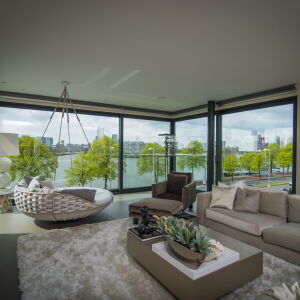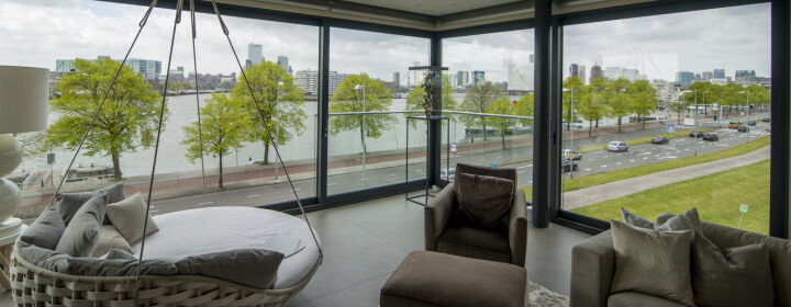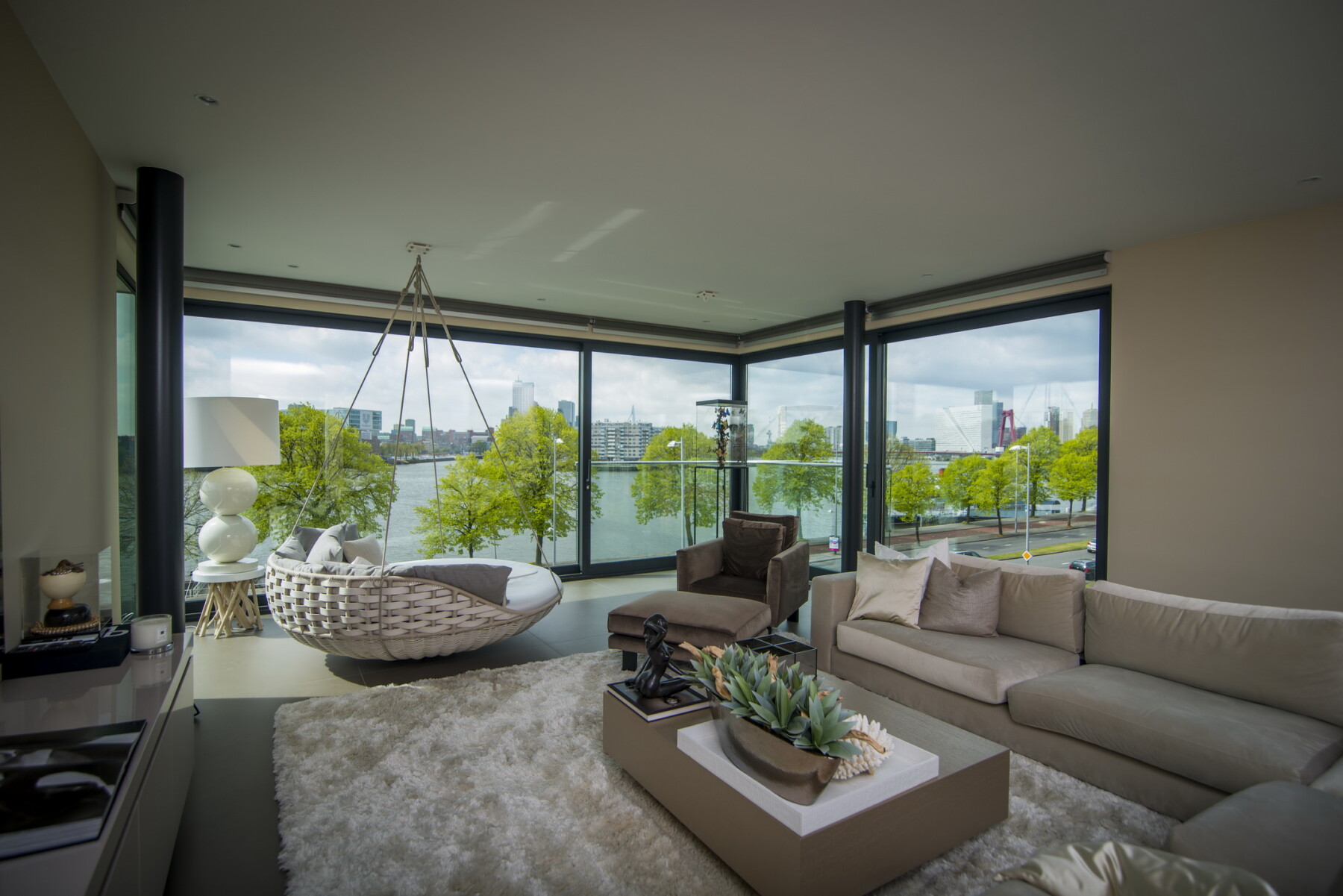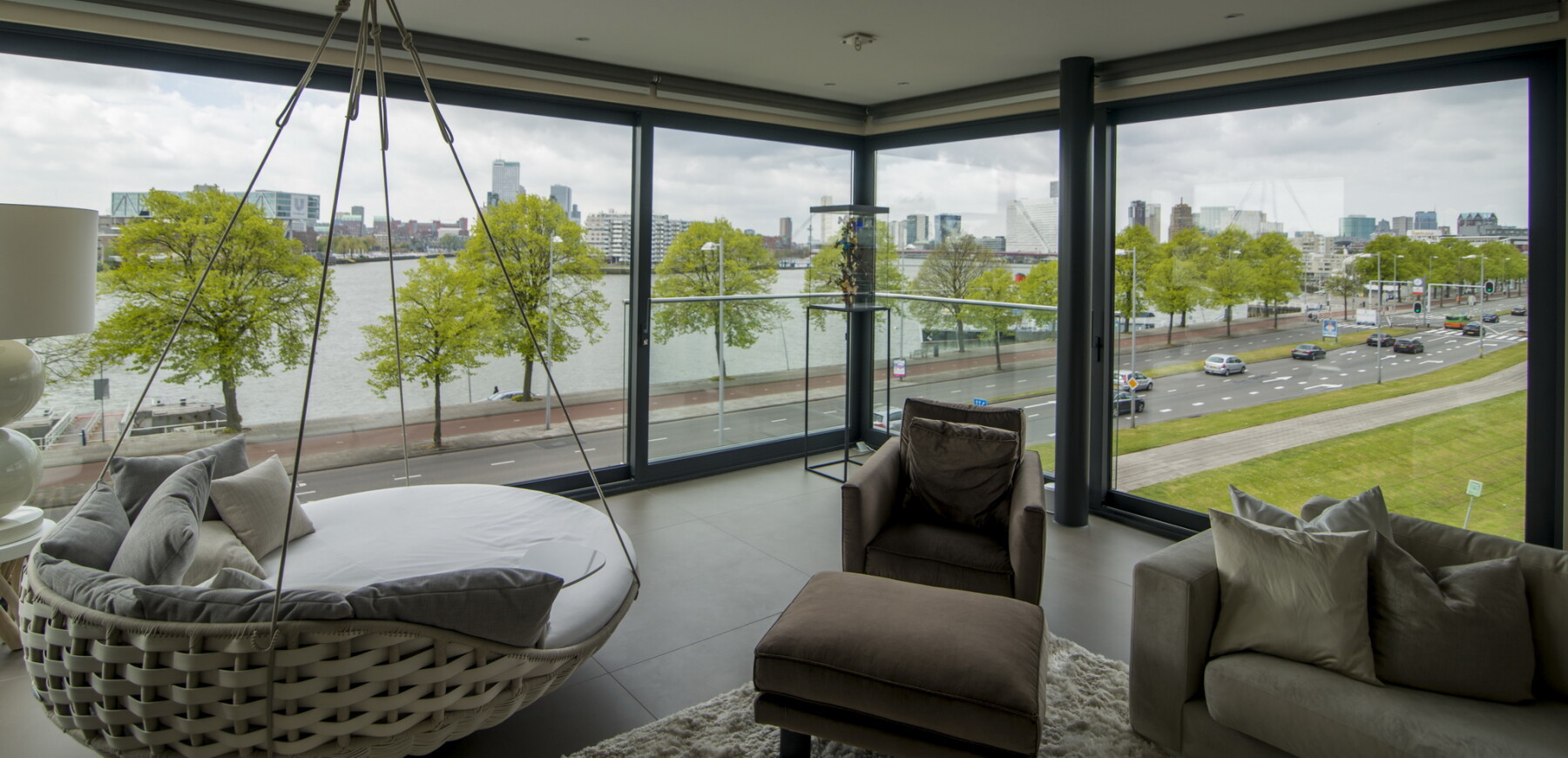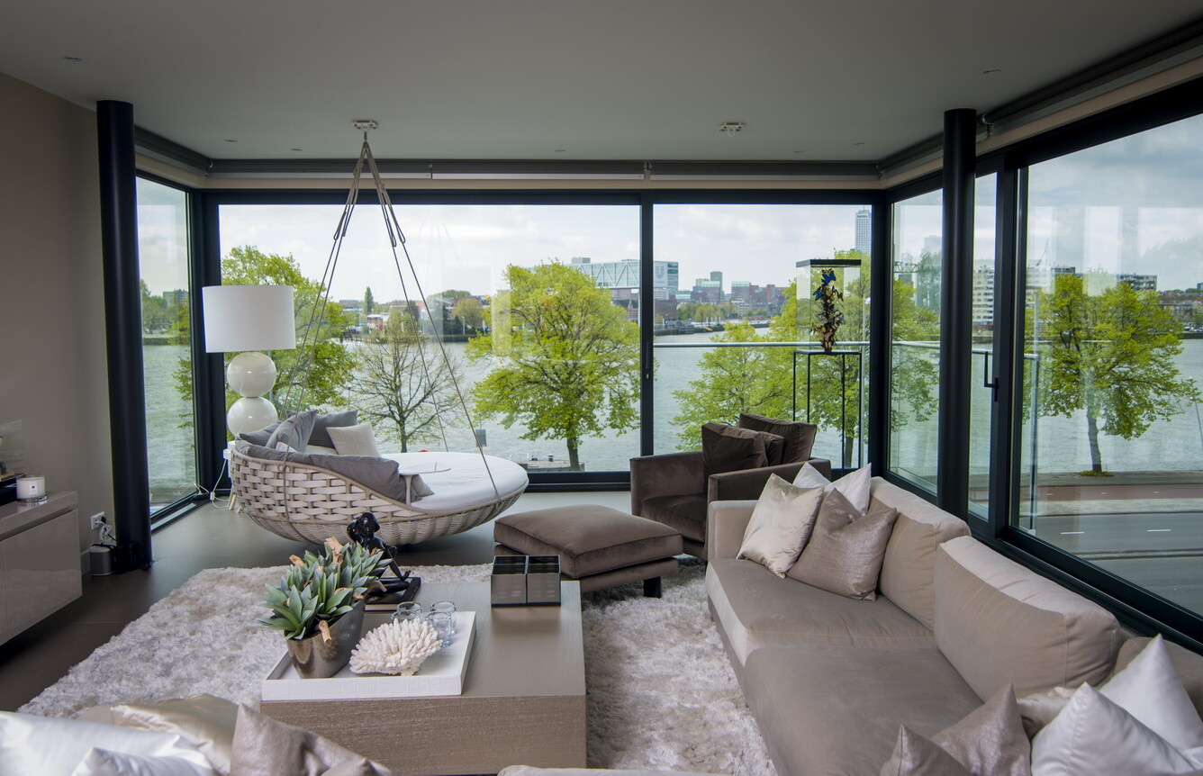 Vanuit de nieuwe woonkamer geeft een groot venster een fenomenaal zicht over de Nieuwe Maas en haar oevers.