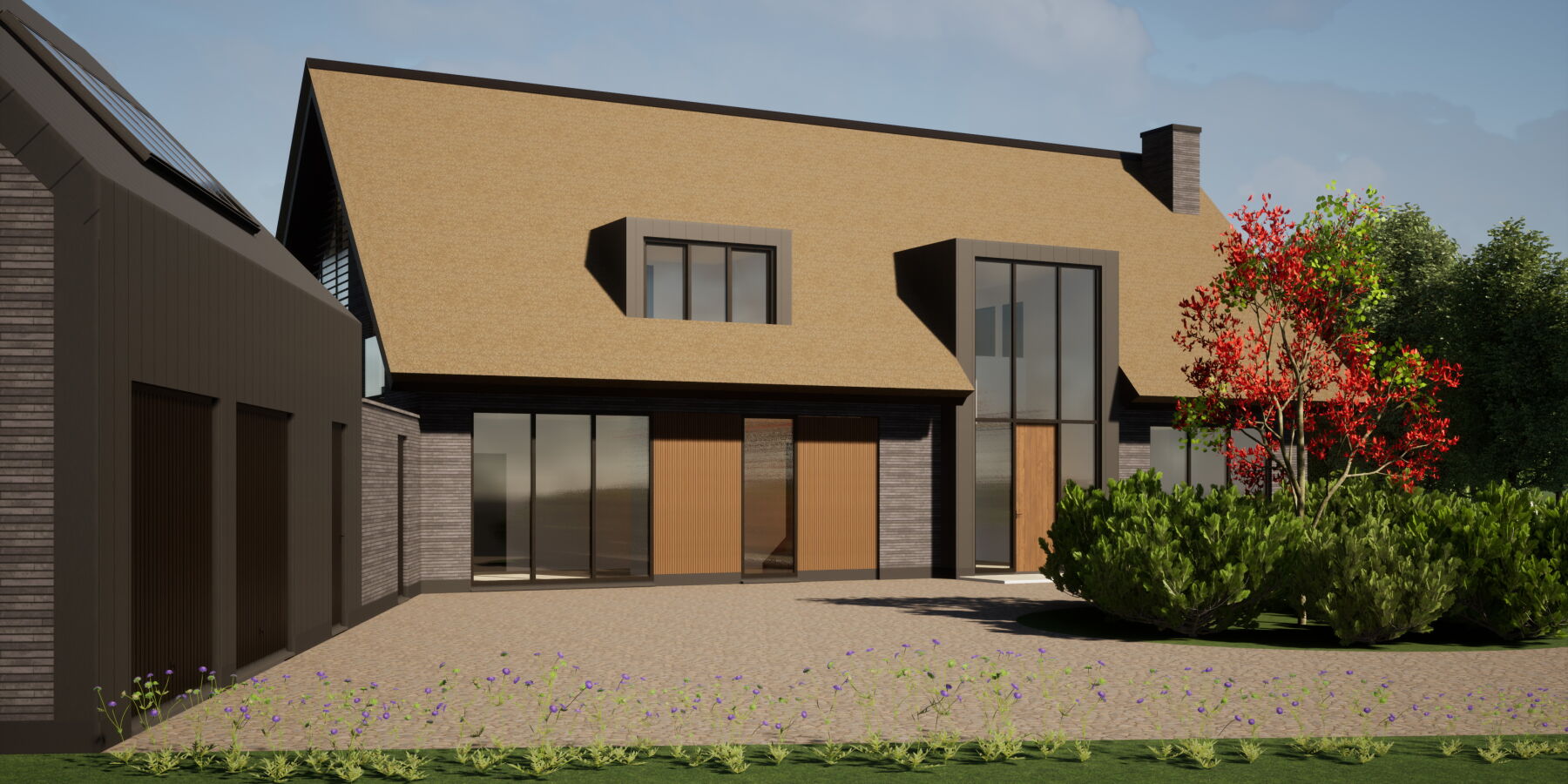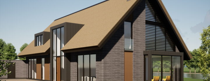 De gevels worden uitgevoerd in een strakke smalle antraciet steen gecombineerd met een rieten. Het dak en gevels van het bijgebouw worden uitgevoerd in donker gepatineerd zink. De entree met de royale vide in de voorgevel is bij aankomst en binnenkomst een ware eyecatcher. Samen met houtcomposiet gevelaccenten heeft de woning een warme en eigentijdse uitstraling.