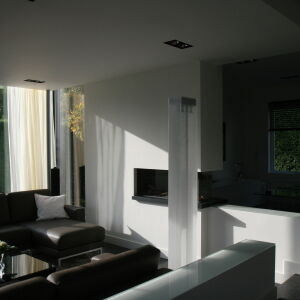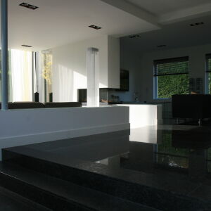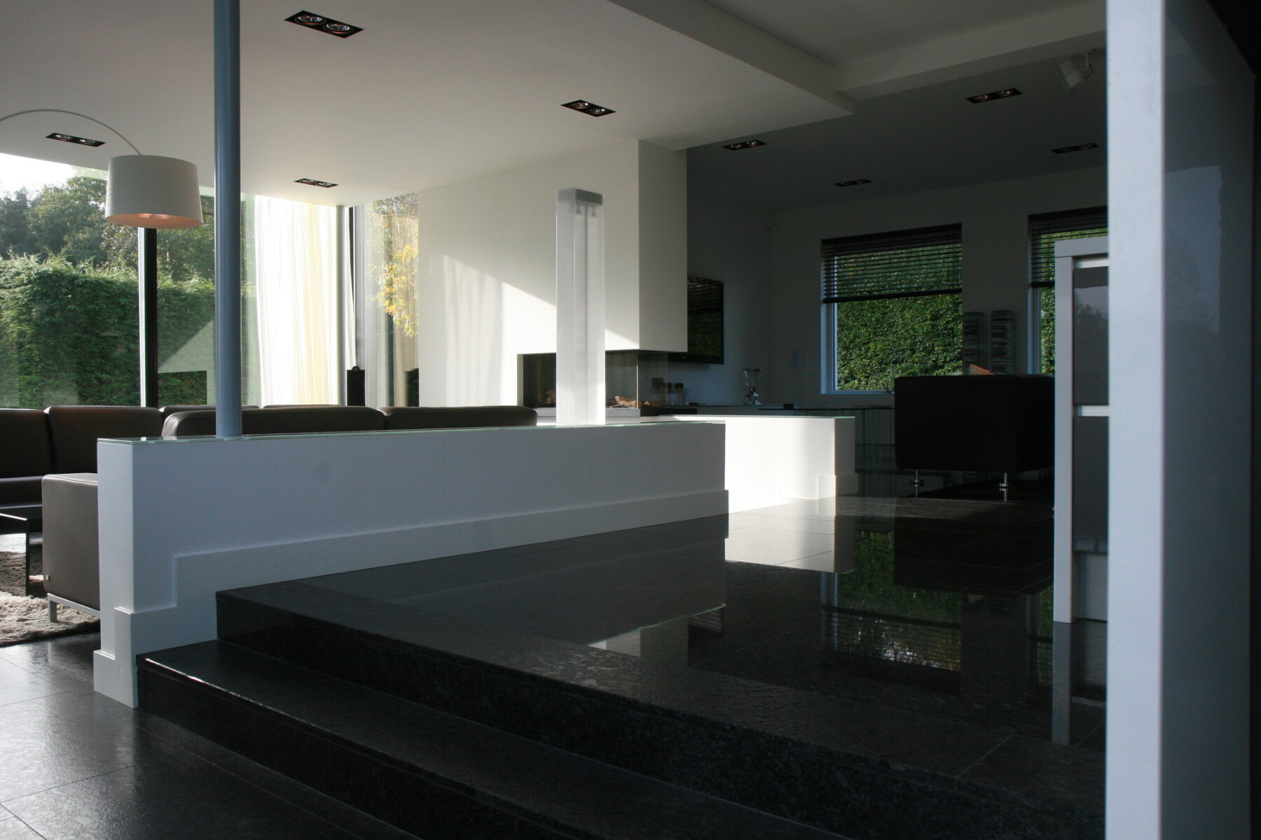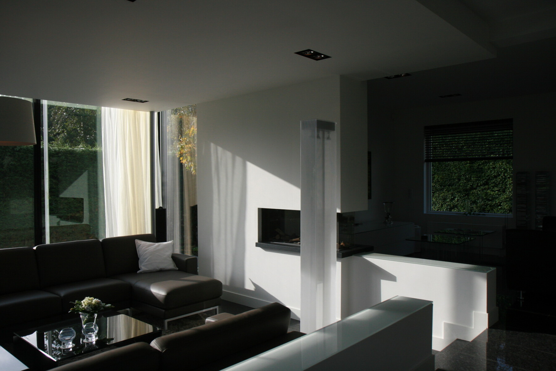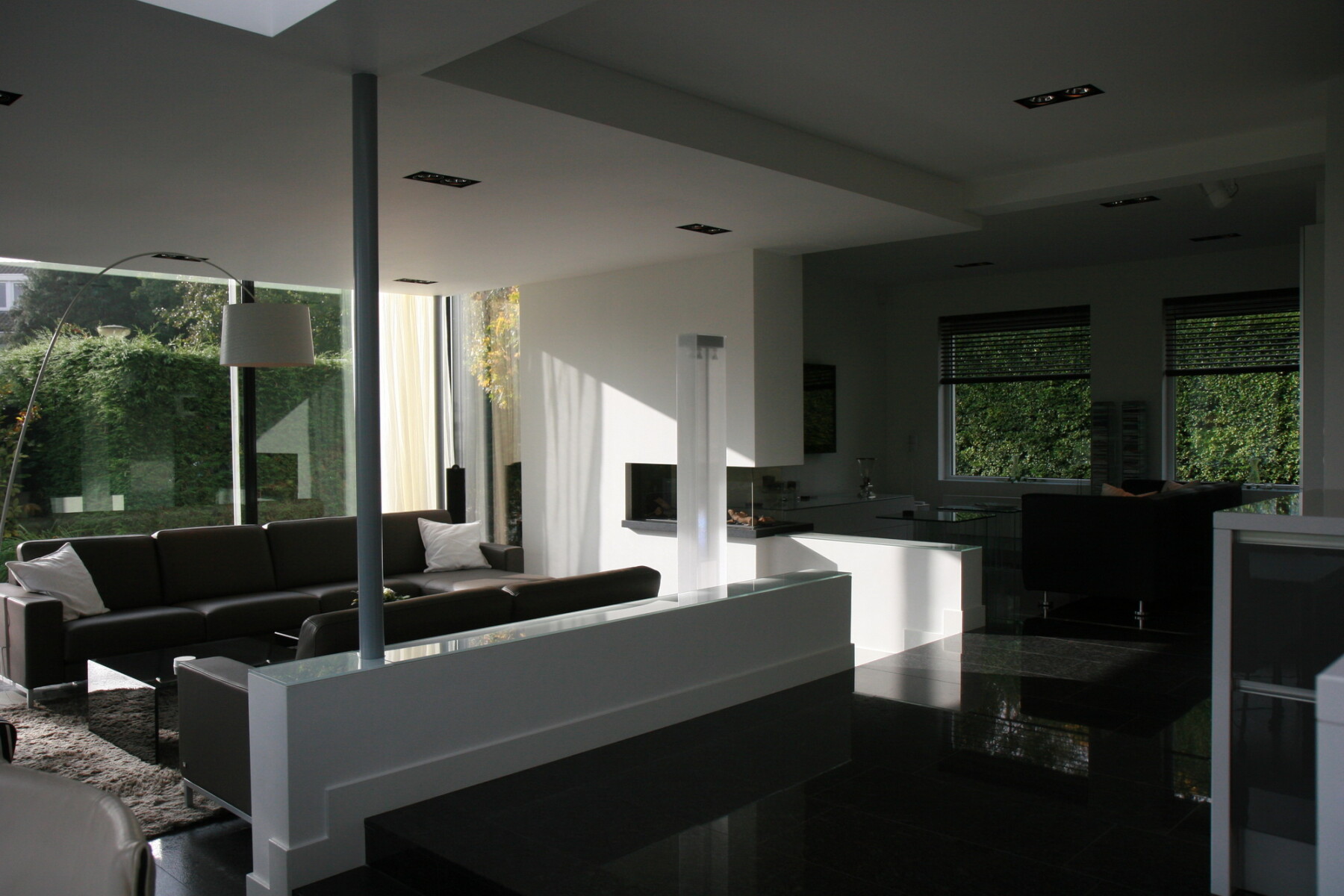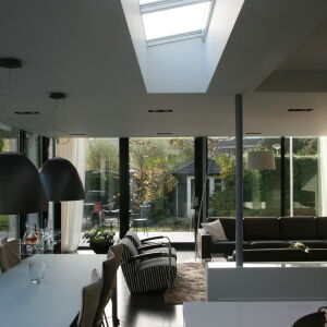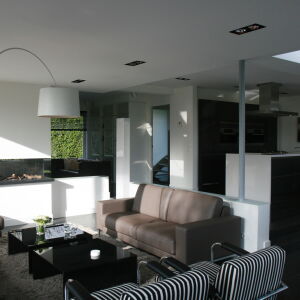 Een uitbouw aan de achterkant alsook aan de zijkant, compleet met verassende niveauverschillen in vloer en plafond hebben de “standaard” woonkamer veranderd in een spannend spel van ruimten voor kook-, eet- ,zit- en multimedia-ervaringen.