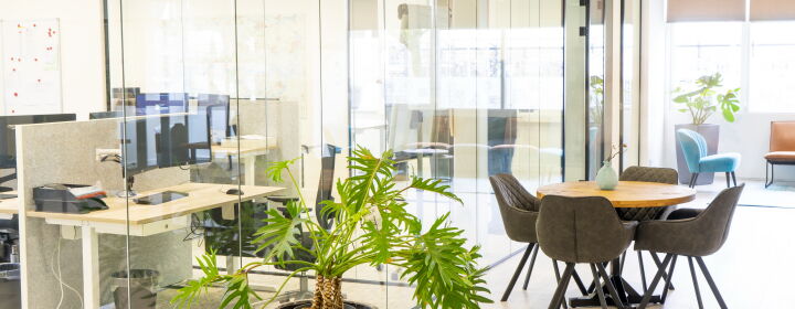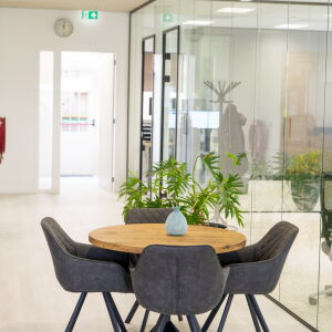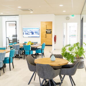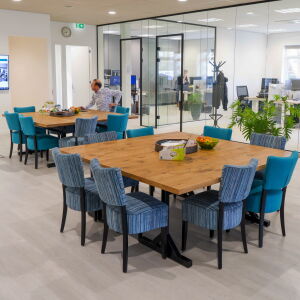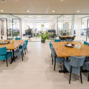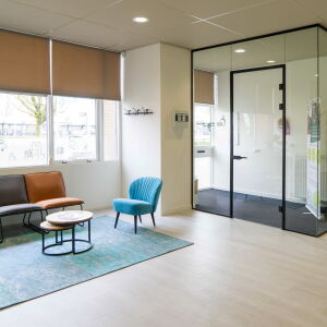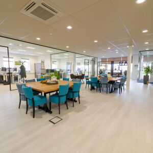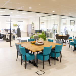 Via de afgesloten glazen hal kom je het kantoor binnen en sta je direct in de centrale ruimte, ook wel de kantoorhuiskamer genoemd. De werkplekken bevinden zich rondom deze centrale ruimte. De huiskamer functioneert zowel als overlegruimte, kantine en biedt plaats voor flexplekken. Bij binnenkomst voel je je dan ook direct thuis.