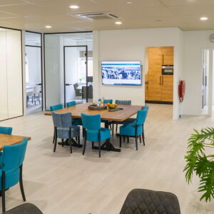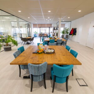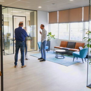 Via de afgesloten glazen hal kom je het kantoor binnen en sta je direct in de centrale ruimte, ook wel de kantoorhuiskamer genoemd. De werkplekken bevinden zich rondom deze centrale ruimte. De huiskamer functioneert zowel als overlegruimte, kantine en biedt plaats voor flexplekken. Bij binnenkomst voel je je dan ook direct thuis.