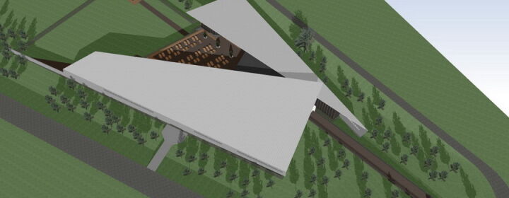 Twee gelijkzijdige driehoeken waarvan de punten wijzen naar de open ruimtes waartussen het gebouw zich bevind; één richting noorden, de ander naar het zuiden. Lichtelijk verdraaid ten opzichte van elkaar waardoor een besloten binnenruimte ontstaat, afgeschermd door de beide gesloten zijgevels.