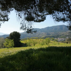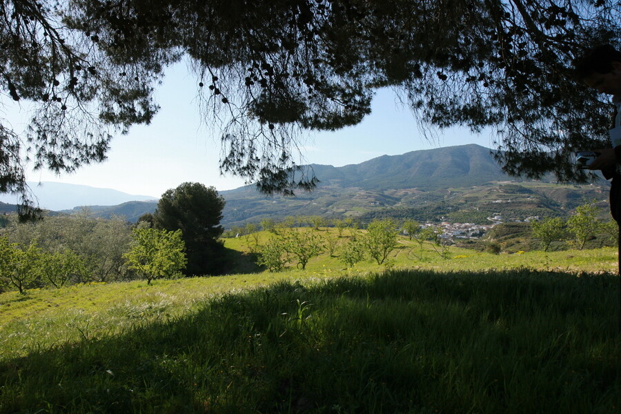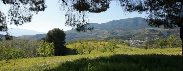 Kleinschaligheid in een grootschalige natuurpracht op een heuvelkam in de uitlopers van de Siërra Nevada, een heuvelachtige omgeving van boomgaarden, bossen en beekjes en pittoreske dorpjes.