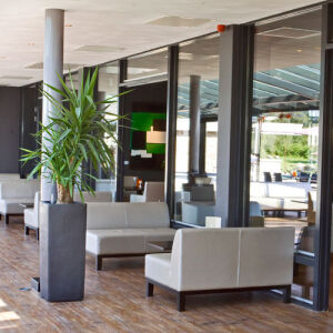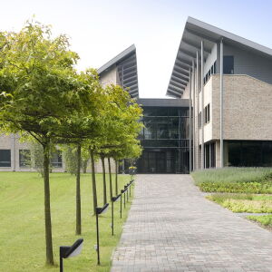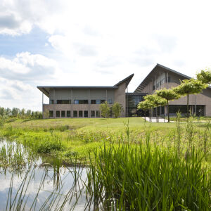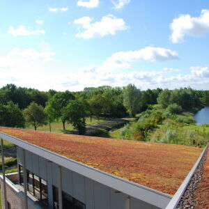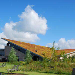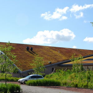 Dit effect wordt versterkt door geleidelijke overgangen, bijvoorbeeld door het sedumdak te laten aansluiten op het maaiveld. Het maaiveld is als het ware opgetrokken waaronder vervolgens de verschillende faciliteiten zijn ondergebracht. Op deze manier is het gebouw geheel geïntegreerd in haar omgeving.
