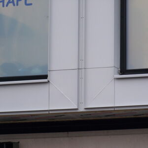 De achtergevel en de zijgevels zijn gesloten en voorzien van een cementgebonden natuurgevelplaat (kleur donker grijs), welke in een rigide en sober raster worden aangebracht.