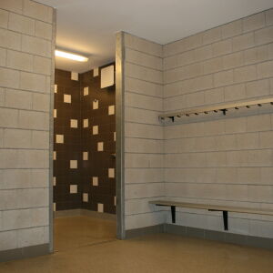 De nieuwbouw met een totaal BVO van ca. 1100 m2 bestaat uit 2 verdiepingen, waarvan op de begane grond 14 kleedkamers, een EHBO ruimte, onderhoudsruimte en diverse sanitaire voorzieningen zijn gesitueerd.
